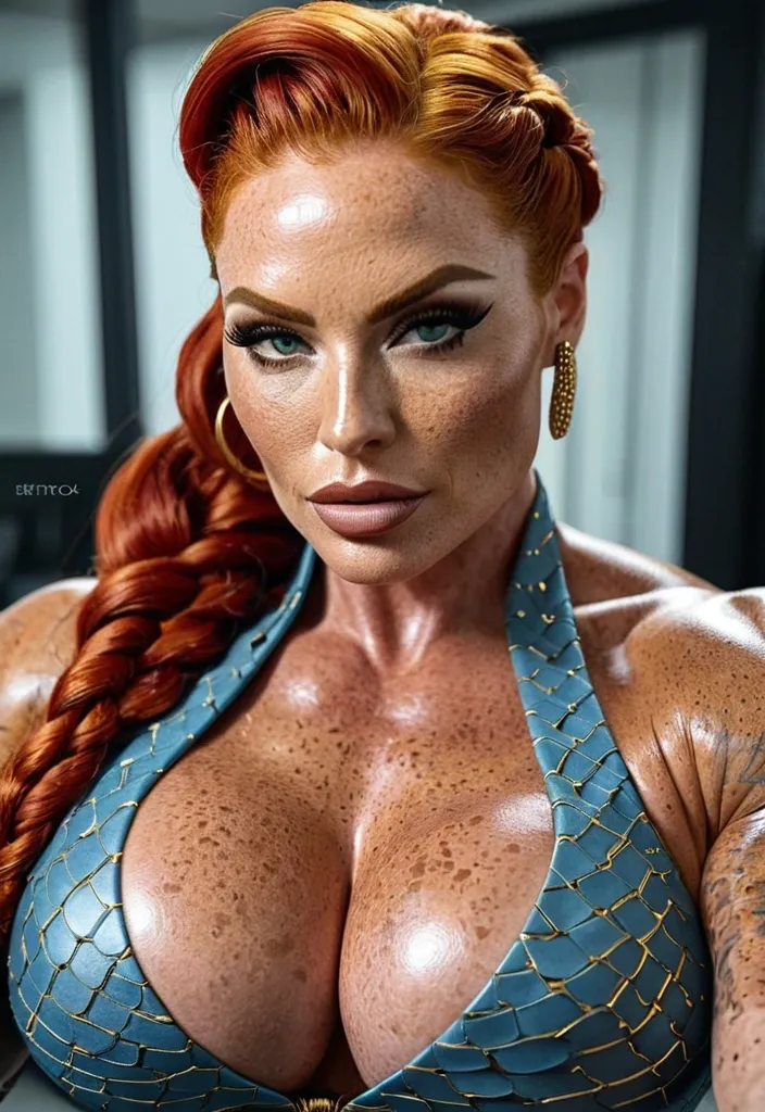 Generate Gorgeous female boss , bimbo , hourglass body , abnormally massive female bodybuilder , gorgeous , close up , full lips , big booty , redheaded , freckles on face and breast , braided design hair , feminine silhouette , too big breast , big booty , sexy thighs abs , silhouette , up close , flexing biceps , beautiful green eyes , legs are iconic and defining physical feature , both visually and in terms of combat ability.wearing an outfit that is a striking blend of elegance , power , and femininity , designed to command attention in any room. The suit is tailored to perfection , hugging the wearer’s curves with precision while emphasizing a structured silhouette. The fabric itself is a refined grey tweed patterned with subtle white grid lines , giving the suit a texture that feels both sophisticated and modern. The blazer features broad blue lapels and gold button accents , adding a luxurious touch that elevates the look beyond typical business attire. The matching high-waisted trousers elongate the frame , further enhancing the poised and commanding effect of the ensemble.The styling choices amplify the boldness of the suit. The inner blouse is a silky , greybutton-down shirt that complements the tweed’s tone while introducing a softer , feminine balance to the sharp tailoring of the jacket. The blouse peeks out neatly from under the blazer , maintaining elegance without drawing focus away from the suit’s commanding cut. Accessories are kept minimal yet intentional: a delicate layered gold necklace and hoop earrings that add glimmers of light and luxury without overpowering the outfit. The choice of voluminous , honey-brown braids cascading down her shoulders frames the face with both confidence and glamour , completing the commanding visual.Altogether , this look communicates a blend of authority and allure. It is business-ready yet fashion-forward , balancing corporate structure with vibrant femininity. The color palette blue , grey and gold avoids being overly delicate , instead embracing the richness of texture , structure , and presence. This is the kind of ensemble that speaks to ambition , sophistication , and personal style—ideal for someone who thrives in positions of influence but insists on expressing her individuality with bold elegance. It’s not just clothing—it’s a statement of power wrapped in grace. Freckles , Light reflecting green eyes , short fingnernails ,