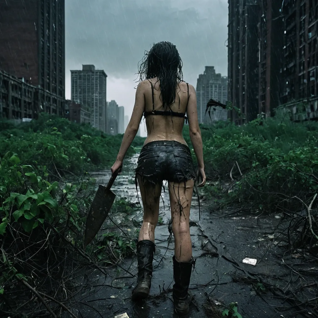 From behind A lone woman dressing in worn tattered form-fitting leather shorts with scuff marks and utility pouches , , pale strong things running on a desolate , overgrown beach , where nature is aggressively reclaiming the remnants of a forgotten civilization. She holding short bloody machette running at faraway Crumbling tilted and dark New York skyscrapers all entwined with vibrant , untamed vines. The raincloud swirling dropping rains on her face and thighs. The atmosphere is heavy with a sense of wonder and melancholy. Dramatic composition , heavy film grain , and an overall atmospheric mood. ,