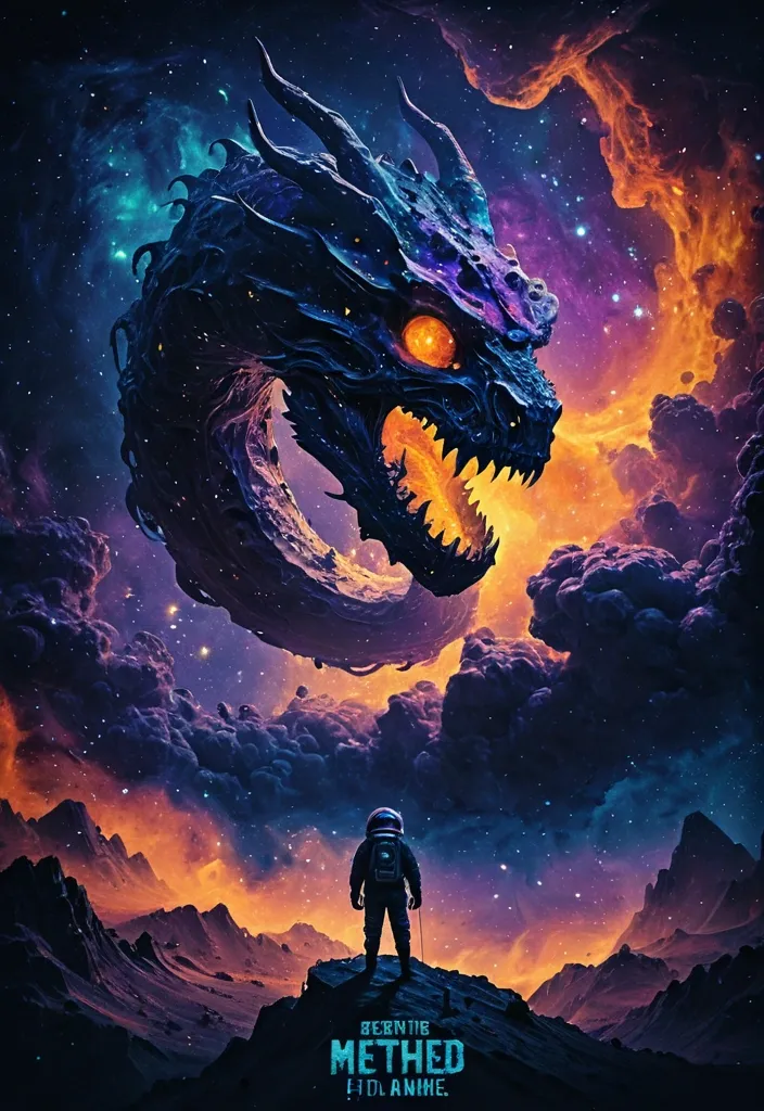 A solitary astronaut adrift in the inky blackness of space , tethered to a colossal , ancient dragon skull floating amidst a nebula of swirling cosmic dust and starlight. The scene is framed like a vintage sci-fi movie poster , with bold typography and a dramatic color palette of deep blues , purples , and fiery oranges. Evokes a sense of grand mystery and isolation , rendered in a cinematic poster style with dramatic lighting. ,