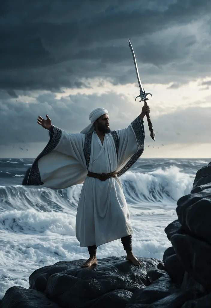 Extremely realistic , award-winning cinematic photograph , ultra-HD 32K resolution , hyperrealism , hyper-detailed photorealistic style , museum-grade realism , flawless composition , physically accurate lighting , global illumination , volumetric atmosphere , octane render 1.7 quality , IMAX film still , ultra-wide anamorphic lens look (14mm) , deep cinematic depth , zero noise , natural film grain , premium color grading. A lone Muslim warrior stands on a rocky outcrop , arms outstretched , facing massive , towering waves. He wears a flowing white thobe or jubba beneath a dark wool cloak with geometric embroidery , a leather belt holding a curved scimitar at his hip. A white turban (imama) is wrapped around his head , with loose ends billowing in the wind. His silhouette is powerful against the stormy sky—arms spread wide as if embracing or commanding the sea. The waves , rendered in dynamic , textured shades of deep blue and frothing white , create a dramatic , almost surreal tunnel effect with the sky visible through the center. The ocean's surface is choppy and violent. The overall mood is powerful , spiritual , and awe-inspiring—a warrior in communion with the raw force of nature. ,