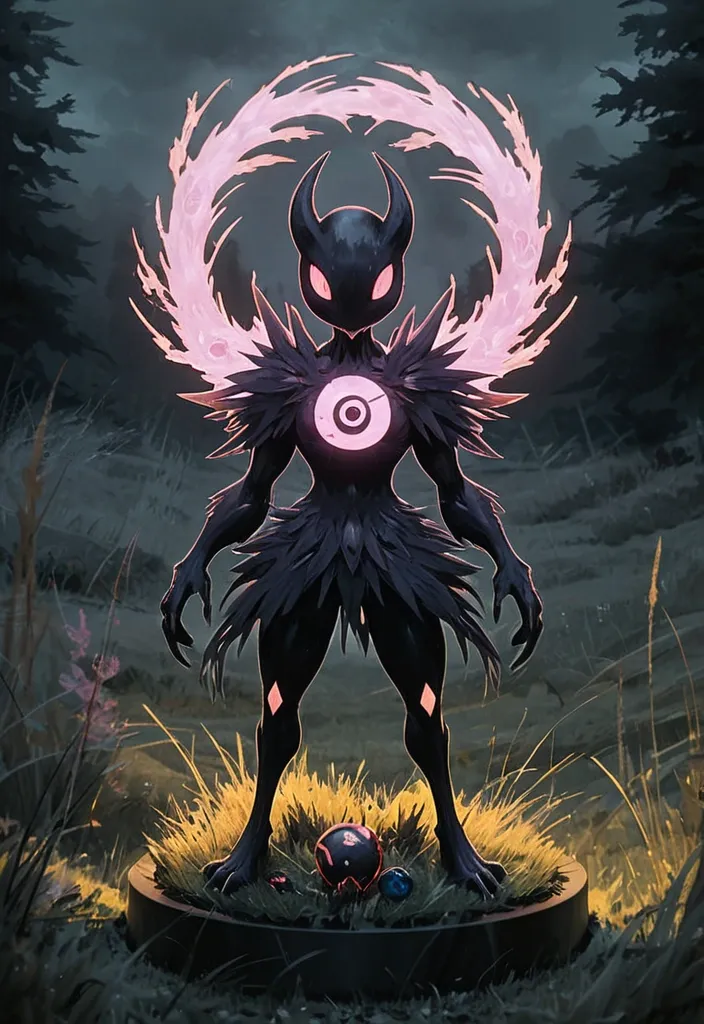 strong painterly composition \{painting|faux-oil painting|dark_romanticism|painterly composition\} , digital_media; centred_to_view , centerpiece; 1Pokemon , solo , painted_from_anime , based_on_type \{Ghost|Fire|Grass|Psychic|Metal\} , conceptual_pokemon_focus , pokemon_creature; fullbody , stands , small circular_riser ,