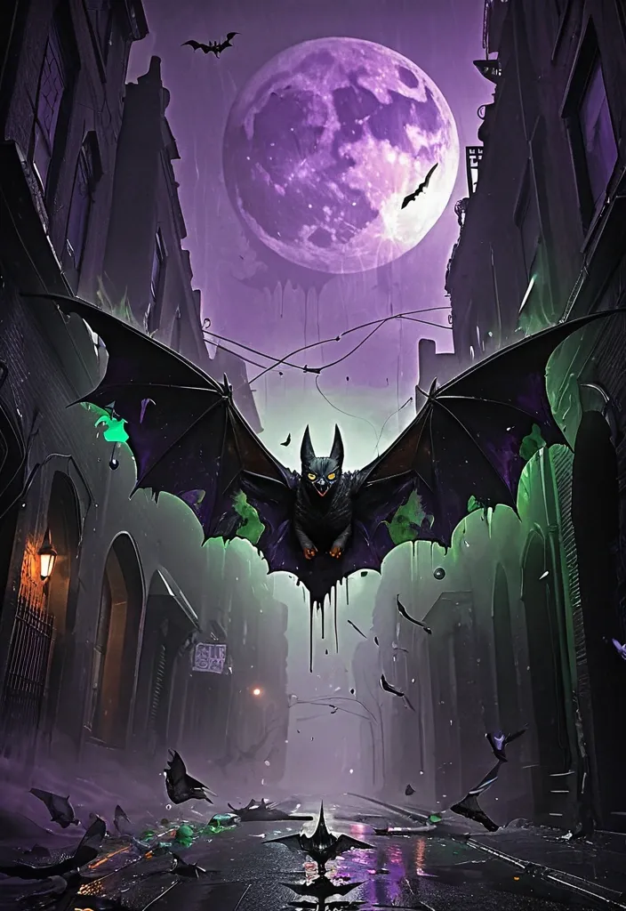 A massive , nightmarish bat dominates the center of a fog-drenched alleyway , its leathery wings outstretched to an almost impossible span. abstract background with splashes of green , purple , and an orange moon. Bats swirl around him as he clutches a sharp object , exuding confidence and menace. The scene is vibrant with bold colors and a dripping paint effect. ,