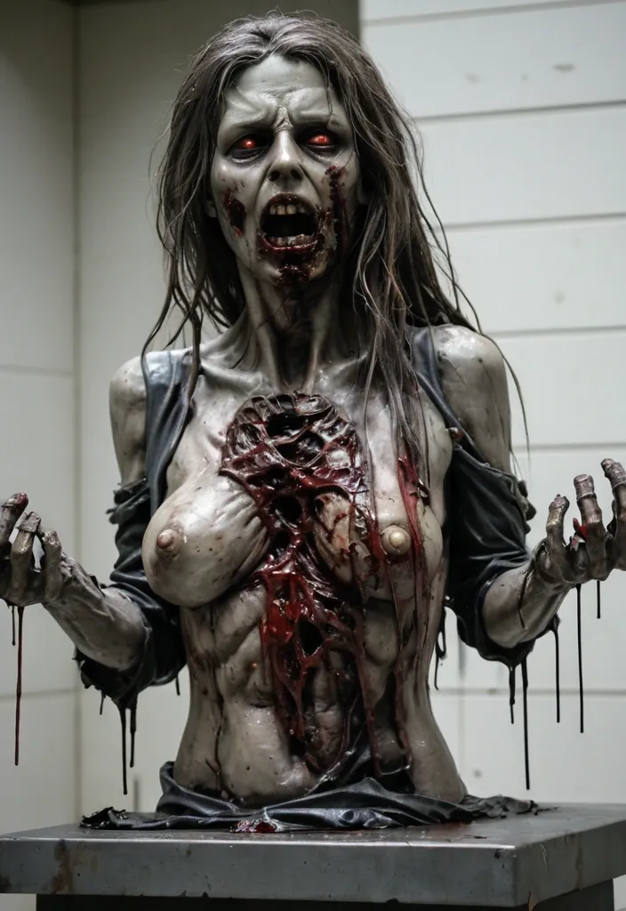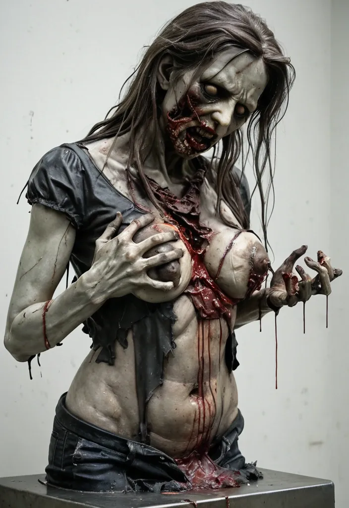un busto de una mujer zombie , sobre un pedestal de acero. tiene el de pelo largo alborotado. con la ropa rasgada de la que se le sale un pecho , con ambas manos sontiene una polla de un hombre al que se la arracno recientemente y aun esa sangrando , esta en posicion que indica que esta a punto de comersela ,