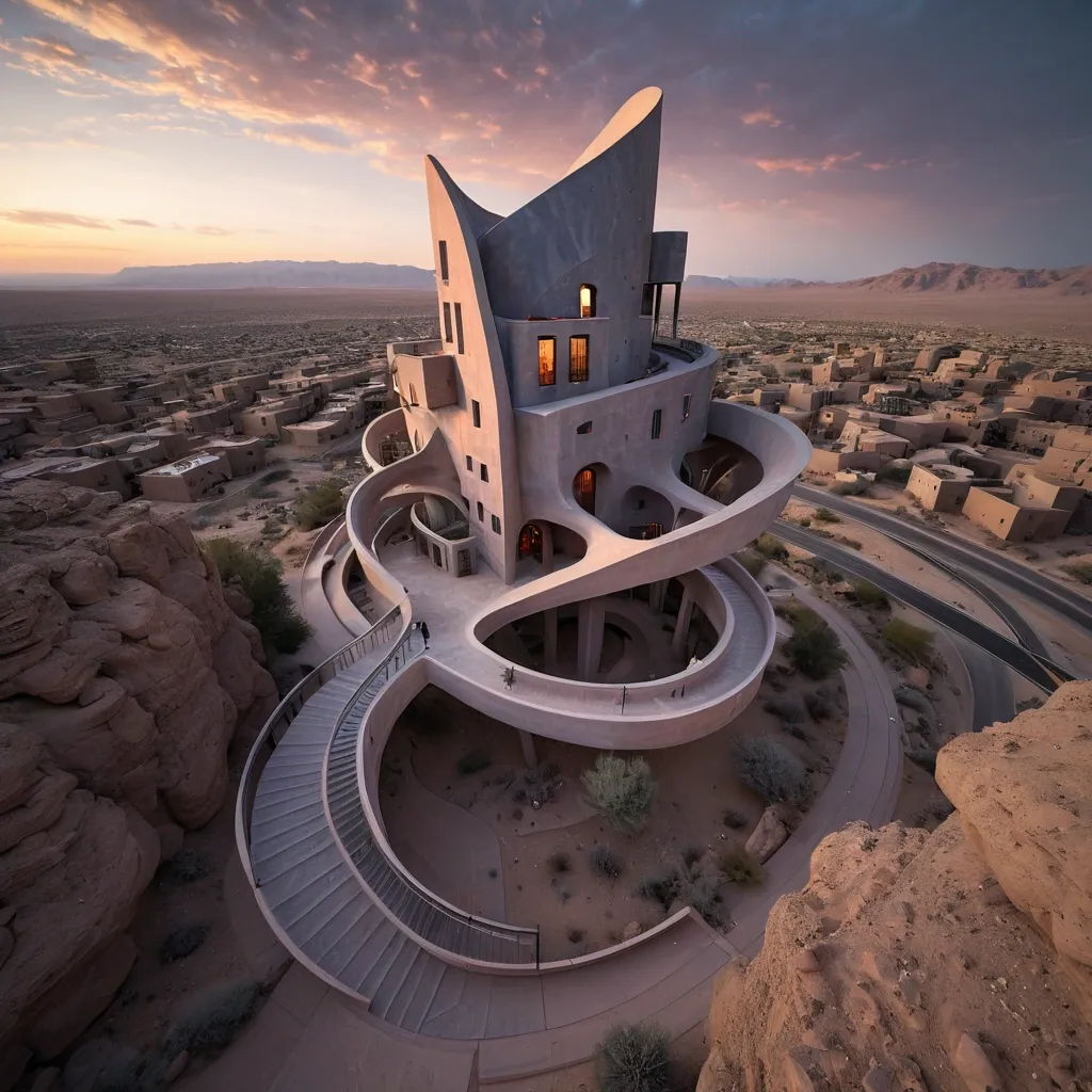 Bird's eye view , view from top , a Giant Wine Glass shaped , inspired by restorunt architecture. A chaotic urban block with twisted geometric forms - skyscrapers bending into impossible angles , roads looping like möbius strips , and bridges connecting disjointed structures on middle of desert. A winding stone staircase leads from the desert to an open doorway , inviting viewers into the house. The landscape is illuminated by soft , ethereal light from a distant moon , casting a dreamy glow over the scene. The sky is rich with dark , brooding clouds , interspersed with bursts of soft pastel colors , suggesting the moments before sunset. A solitary tree leans against the structure , adding an organic touch among the surreal elements. ,