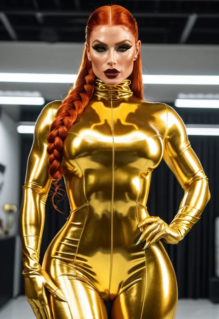 Generate Gorgeous female boss , bimbo , hourglass body , abnormally massive female bodybuilder , gorgeous , close up , full lips , big booty , redheaded , freckles on face and breast , braided design hair , feminine silhouette , too big breast , big booty , sexy thighs abs , silhouette , up close , flexing biceps , beautiful green eyes , legs are iconic and defining physical feature , both visually and in terms of combat ability.wearing an outfit that is a striking blend of elegance , power , and femininity , designed to command attention in any room. The suit is tailored to perfection , hugging the wearer’s curves with precision while emphasizing a structured silhouette. The fabric itself is a refined grey tweed patterned with subtle white grid lines , giving the suit a texture that feels both sophisticated and modern. The blazer features broad blue lapels and gold button accents , adding a luxurious touch that elevates the look beyond typical business attire. The matching high-waisted trousers elongate the frame , further enhancing the poised and commanding effect of the ensemble.The styling choices amplify the boldness of the suit. The inner blouse is a silky , greybutton-down shirt that complements the tweed’s tone while introducing a softer , feminine balance to the sharp tailoring of the jacket. The blouse peeks out neatly from under the blazer , maintaining elegance without drawing focus away from the suit’s commanding cut. Accessories are kept minimal yet intentional: a delicate layered gold necklace and hoop earrings that add glimmers of light and luxury without overpowering the outfit. The choice of voluminous , honey-brown braids cascading down her shoulders frames the face with both confidence and glamour , completing the commanding visual.Altogether , this look communicates a blend of authority and allure. It is business-ready yet fashion-forward , balancing corporate structure with vibrant femininity. The color palette blue , grey and gold avoids being overly delicate , instead embracing the richness of texture , structure , and presence. This is the kind of ensemble that speaks to ambition , sophistication , and personal style—ideal for someone who thrives in positions of influence but insists on expressing her individuality with bold elegance. It’s not just clothing—it’s a statement of power wrapped in grace. In luxury living legs that could crush a watermelon , skirt high boots are a bold and striking statement piece , crafted in glossy black patent leather that gives them a sleek , polished finish. Rising to just below the knee , the boots feature three adjustable buckle straps along the shaft , adding both edge and detail to their design. The towering stiletto heel , paired with a thick platform sole , creates an ultra-dramatic silhouette that elongates the leg and exudes power and confidence. With their combination of shine , height , and structure , these boots perfectly balance fierce femininity with high-fashion allure.She’s wearing a glossy gold ensemble featuring a sleek bodysuit , thigh-high boots , and long gloves that all match in a metallic , high-status shine. The flowing gold skirt adds dramatic movement , while bold green accessories give the whole look a regal , futuristic edge. ,