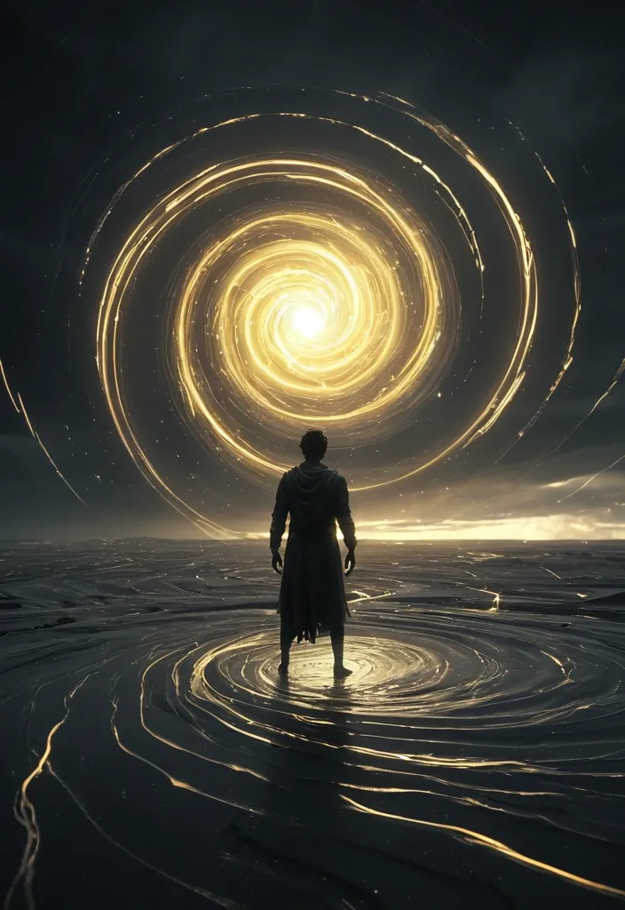 A lone figure standing on a desolate plain under a stormy ghost face , twilight sky. Emerging from a dark , swirling vortex behind the figure , a golden light beams down , Style: Celestial ethereal , abstract , digital art black Lighting: Dramatic backlighting , contrasting dark background Composition: dynamic diagonal , composition , upward gaze Details: vortex water waves and bobbles , streaking white light trail , sense of movement and wonder , magical atmosphere Quality: High detail , 4K , Masterpiece , Rendered in Octane. ,