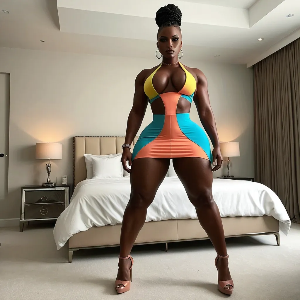 Generate a dark-skinned African-American woman , gorgeous female boss , bimbo , hourglass body , gorgeous , close up , full lips , big booty , black hair , braided-style-mohawk that she wears bald on the side , feminine silhouette , too big breast , big booty , sexy thighs abs , silhouette , up close , flexing biceps , beautiful light hazel eyes , legs are iconic and defining physical feature , both visually and in terms of combat ability.wearing an outfit that is a striking blend of elegance , power , and femininity , designed to command attention in any room. outfit in this image is a modern , giving it both structure and a touch of relaxed style. highlighting her curves while keeping the look balanced and versatile. Its neutral tone contrasts nicely against the blue denim , keeping the ensemble cohesive without overpowering the statement of the.Completing the polished and fashionable. Together , the outfit blends everyday comfort with bold , confident styling. This is the kind of ensemble that speaks to ambition , sophistication , and personal style—ideal for someone who thrives in positions of influence but insists on expressing her individuality with bold elegance. It’s not just clothing—it’s a statement of power wrapped in grace , Massive cleavage thunder thighs , enormous butt , muscular legs , hazel eyes , She’s wearing a bold halter-style dress with bright pastel color blocking that makes the whole look feel fun , confident , and ready for the spotlight. The cutouts at the waist and fitted silhouette put her curves front and center in a stylish , attention-grabbing way. ,