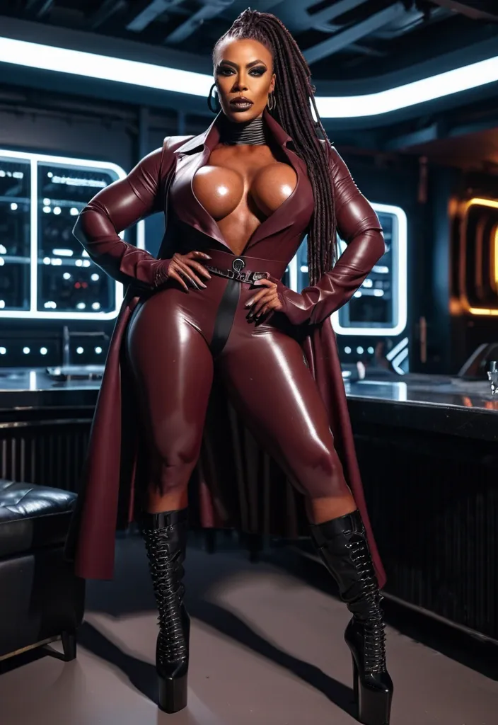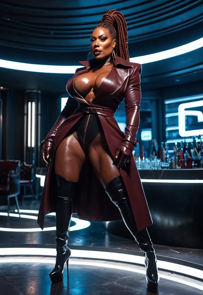 Generate Gorgeous 42 years old , female boss , dark-skinned African-American woman , pointy face , bimbo , hourglass body , abnormally massive female bodybuilder , gorgeous , close up , full lips , big booty , stylish futuristic dreadlocks in ponytail , , feminine silhouette , too big breast , big booty , sexy thighs abs , silhouette , up close , flexing biceps , beautiful brown eyes , legs are iconic and defining physical feature , both visually and in terms of combat ability.wearing an outfit that is a striking blend of elegance , power , and femininity , designed to command attention in any room. The suit is tailored to perfection , hugging the wearer’s curves with precision while emphasizing a structured silhouette. The fabric itself is a refined grey tweed patterned with subtle white grid lines , giving the suit a texture that feels both sophisticated and modern. The blazer features broad blue lapels and gold button accents , adding a luxurious touch that elevates the look beyond typical business attire. The matching high-waisted trousers elongate the frame , further enhancing the poised and commanding effect of the ensemble.The styling choices amplify the boldness of the suit. The inner blouse is a silky , greybutton-down shirt that complements the tweed’s tone while introducing a softer , feminine balance to the sharp tailoring of the jacket. The blouse peeks out neatly from under the blazer , maintaining elegance without drawing focus away from the suit’s commanding cut. Accessories are kept minimal yet intentional: a delicate layered gold necklace and hoop earrings that add glimmers of light and luxury without overpowering the outfit. The choice of voluminous , honey-brown braids cascading down her shoulders frames the face with both confidence and glamour , completing the commanding visual.Altogether , this look communicates a blend of authority and allure. It is business-ready yet fashion-forward , balancing corporate structure with vibrant femininity. The color palette blue , grey and gold avoids being overly delicate , instead embracing the richness of texture , structure , and presence. This is the kind of ensemble that speaks to ambition , sophistication , and personal style—ideal for someone who thrives in positions of influence but insists on expressing her individuality with bold elegance. It’s not just clothing—it’s a statement of power wrapped in grace. In luxury living legs that could crush a watermelon , skirt high boots are a bold and striking statement piece , crafted in glossy black patent leather that gives them a sleek , polished finish. Rising to just below the knee , the boots feature three adjustable buckle straps along the shaft , adding both edge and detail to their design. The towering stiletto heel , paired with a thick platform sole , creates an ultra-dramatic silhouette that elongates the leg and exudes power and confidence. With their combination of shine , height , and structure , these boots perfectly balance fierce femininity with high-fashion allure. High cheekbones , prominent jawline , gorgeous big brown light hazel honey , , enormous breast , wearing dark burgundy trench-coat p , and black well designed black dress short , gray skirt , and black high heel boots , standing in futuristic jazz club , ,