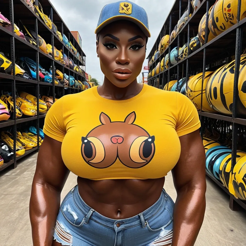 Generate Gorgeous female boss , bimbo , dark-skinned very African-American female , hourglass body , abnormally massive female bodybuilder , gorgeous , close up , full lips , big booty , brown , on face and breast , short pixie hair , shaved on the side , feminine silhouette , too big breast , big booty , sexy thighs abs , silhouette , up close , flexing biceps , beautiful green eyes , legs are iconic and defining physical feature , both visually and in terms of combat ability.wearing an outfit that is a striking blend of elegance , power , and femininity , designed to command attention in any room. The suit is tailored to perfection , hugging the wearer’s curves with precision while emphasizing a structured silhouette. The fabric itself is a refined grey tweed patterned with subtle white grid lines , giving the suit a texture that feels both sophisticated and modern. The blazer features broad blue lapels and gold button accents , adding a luxurious touch that elevates the look beyond typical business attire. The matching high-waisted trousers elongate the frame , further enhancing the poised and commanding effect of the ensemble.The styling choices amplify the boldness of the suit. The inner blouse is a silky , greybutton-down shirt that complements the tweed’s tone while introducing a softer , feminine balance to the sharp tailoring of the jacket. The blouse peeks out neatly from under the blazer , maintaining elegance without drawing focus away from the suit’s commanding cut. Accessories are kept minimal yet intentional: a delicate layered gold necklace and hoop earrings that add glimmers of light and luxury without overpowering the outfit. The choice of voluminous , honey-brown braids cascading down her shoulders frames the face with both confidence and glamour , completing the commanding visual.Altogether , this look communicates a blend of authority and allure. It is business-ready yet fashion-forward , balancing corporate structure with vibrant femininity. The color palette blue , grey and gold avoids being overly delicate , instead embracing the richness of texture , structure , and presence. This is the kind of ensemble that speaks to ambition , sophistication , and personal style—ideal for someone who thrives in positions of influence but insists on expressing her individuality with bold elegance. It’s not just clothing—it’s a statement of power wrapped in grace. In luxury living legs that could crush a watermelon , skirt high boots are a bold and striking statement piece , crafted in glossy black patent leather that gives them a sleek , polished finish. Rising to just below the knee , the boots feature three adjustable buckle straps along the shaft , adding both edge and detail to their design. The towering stiletto heel , paired with a thick platform sole , creates an ultra-dramatic silhouette that elongates the leg and exudes power and confidence. With their combination of shine , height , and structure , these boots perfectly balance fierce femininity with high-fashion allure. High cheekbones , prominent jawline , gorgeous big light reflecting hazel eyes , enormous breast , cartoon bunny on yellow t-shirt-shirt , denim shorts , denim baseball cap walking in amusement park , ,