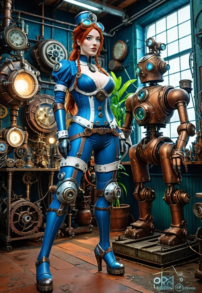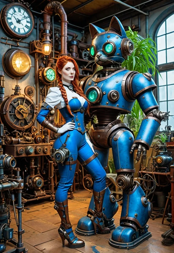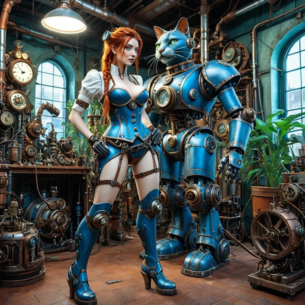 Masterpiece photorealistic full-length of a 21-year-old braid redhead girl with gogle in mechanical steampunk suit blue and white is standing up ahand on her hip and looking at a cute bronze and blue steampunk giant mechanical cat robot. In a coloured steampunk workshop a lot of broken old machinery all over the place , wall gaslight. A little green plant in the room ,