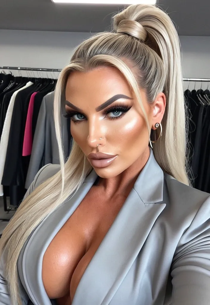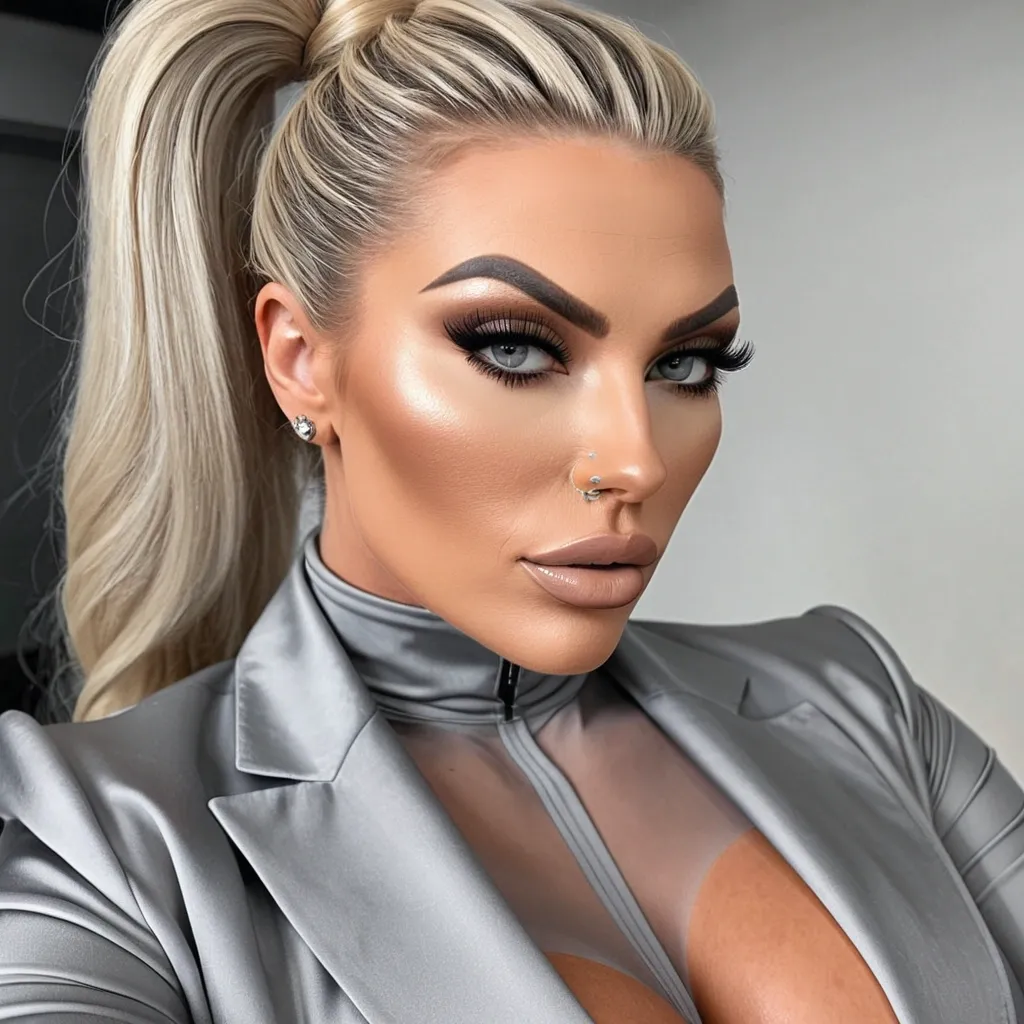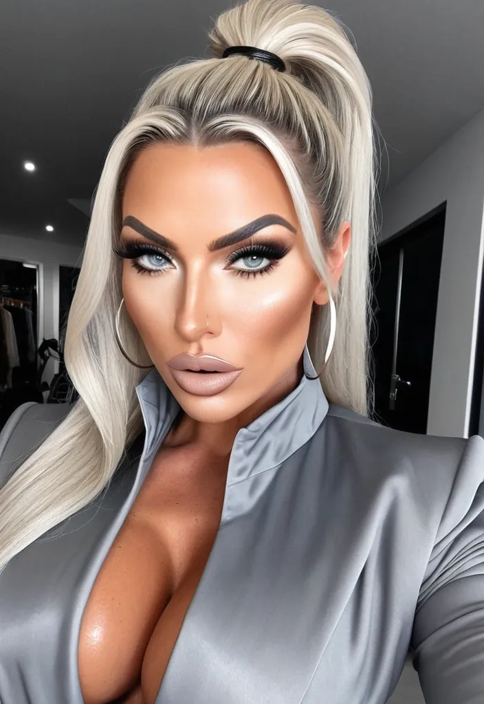 Generate Gorgeous female boss , bimbo , hourglass body , abnormally massive female bodybuilder , gorgeous , close up , full lips , big booty , blonde , hair in ponytail bun , , feminine silhouette , too big breast , big booty , sexy thighs abs , silhouette , up close , flexing biceps , beautiful oval blue , legs are iconic and defining physical feature , both visually and in terms of combat ability.wearing an outfit that is a striking blend of elegance , power , and femininity , designed to command attention in any room. The suit is tailored to perfection , hugging the wearer’s curves with precision while emphasizing a structured silhouette. The fabric itself is a refined grey tweed patterned with subtle white grid lines , giving the suit a texture that feels both sophisticated and modern. The blazer features broad blue lapels and gold button accents , adding a luxurious touch that elevates the look beyond typical business attire. The matching high-waisted trousers elongate the frame , further enhancing the poised and commanding effect of the ensemble.The styling choices amplify the boldness of the suit. The inner blouse is a silky , greybutton-down shirt that complements the tweed’s tone while introducing a softer , feminine balance to the sharp tailoring of the jacket. The blouse peeks out neatly from under the blazer , maintaining elegance without drawing focus away from the suit’s commanding cut. Accessories are kept minimal yet intentional: a delicate layered gold necklace and hoop earrings that add glimmers of light and luxury without overpowering the outfit. The choice of voluminous , honey-brown braids cascading down her shoulders frames the face with both confidence and glamour , completing the commanding visual.Altogether , this look communicates a blend of authority and allure. It is business-ready yet fashion-forward , balancing corporate structure with vibrant femininity. The color palette blue , grey and gold avoids being overly delicate , instead embracing the richness of texture , structure , and presence. This is the kind of ensemble that speaks to ambition , sophistication , and personal style—ideal for someone who thrives in positions of influence but insists on expressing her individuality with bold elegance. It’s not just clothing—it’s a statement of power wrapped in grace. In luxury living legs that could crush a watermelon , skirt high boots are a bold and striking statement piece , crafted in glossy black patent leather that gives them a sleek , polished finish. Rising to just below the knee , the boots feature three adjustable buckle straps along the shaft , adding both edge and detail to their design. The towering stiletto heel , paired with a thick platform sole , creates an ultra-dramatic silhouette that elongates the leg and exudes power and confidence. With their combination of shine , height , and structure , these boots perfectly balance fierce femininity with high-fashion allure. Gorgeous big oval shaped eyes , pointy face , nose ring , grey sports coat with grey silky modest blouse ,