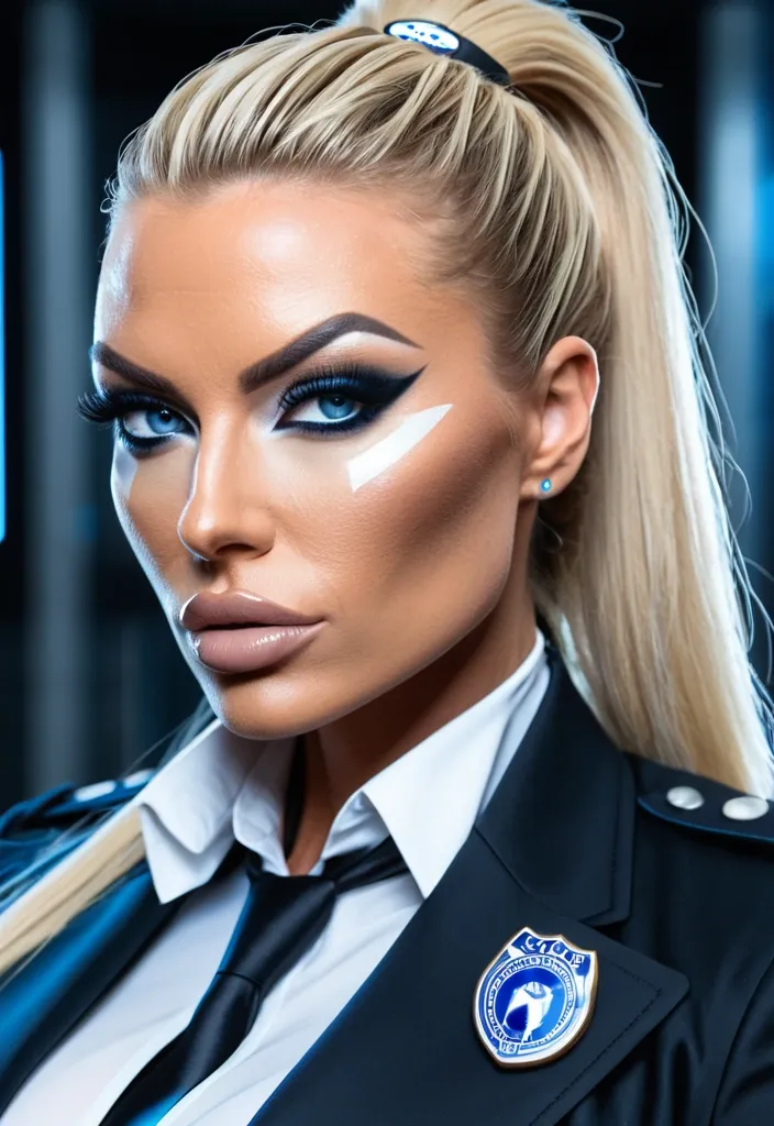 Generate Gorgeous female boss , bimbo , hourglass body , abnormally massive female bodybuilder , gorgeous , close up , full lips , big booty , blonde , big breast , big booty , sexy thighs abs , silhouette , up close , flexing biceps , beautiful oval blue , legs are iconic and defining physical feature , both visually and in terms of combat ability.wearing an outfit that is a striking blend of elegance , power , and femininity , designed to command attention in any room. The suit is tailored to perfection , hugging the wearer’s curves with precision while emphasizing a structured silhouette. The fabric itself is a refined grey tweed patterned with subtle white grid lines , giving the suit a texture that feels both sophisticated and modern. The blazer features broad blue lapels and gold button accents , adding a luxurious touch that elevates the look beyond typical business attire. The matching high-waisted trousers elongate the frame , further enhancing the poised and commanding effect of the ensemble.The styling choices amplify the boldness of the suit. The inner blouse is a silky , greybutton-down shirt that complements the tweed’s tone while introducing a softer , feminine balance to the sharp tailoring of the jacket. The blouse peeks out neatly from under the blazer , maintaining elegance without drawing focus away from the suit’s commanding cut. Accessories are kept minimal yet intentional: a delicate layered gold necklace and hoop earrings that add glimmers of light and luxury without overpowering the outfit. The choice of voluminous , honey-brown braids cascading down her shoulders frames the face with both confidence and glamour , completing the commanding visual.Altogether , this look communicates a blend of authority and allure. It is business-ready yet fashion-forward , balancing corporate structure with vibrant femininity. The color palette blue , grey and gold avoids being overly delicate , instead embracing the richness of texture , structure , and presence. This is the kind of ensemble that speaks to ambition , sophistication , and personal style—ideal for someone who thrives in positions of influence but insists on expressing her individuality with bold elegance. It’s not just clothing—it’s a statement of power wrapped in grace. In luxury living legs that could crush a watermelon , skirt high boots are a bold and striking statement piece , crafted in glossy black patent leather that gives them a sleek , polished finish. Rising to just below the knee , the boots feature three adjustable buckle straps along the shaft , adding both edge and detail to their design. The towering stiletto heel , paired with a thick platform sole , creates an ultra-dramatic silhouette that elongates the leg and exudes power and confidence. With their combination of shine , height , and structure , these boots perfectly balance fierce femininity with high-fashion allure. Gorgeous big oval shaped eyes , pointy face , futuristic black , blue and white chief of police sports coat and tie , with matching shirt , badge ,