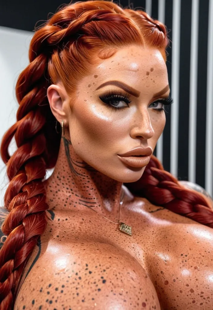 Generate Gorgeous female boss , bimbo , hourglass body , abnormally massive female bodybuilder , gorgeous , close up , full lips , big booty , redheaded , freckles on face and breast , braided design hair , feminine silhouette , too big breast , big booty , sexy thighs abs , silhouette , up close , flexing biceps , beautiful green eyes , legs are iconic and defining physical feature , both visually and in terms of combat ability.wearing an outfit that is a striking blend of elegance , power , and femininity , designed to command attention in any room. The suit is tailored to perfection , hugging the wearer’s curves with precision while emphasizing a structured silhouette. The fabric itself is a refined grey tweed patterned with subtle white grid lines , giving the suit a texture that feels both sophisticated and modern. The blazer features broad blue lapels and gold button accents , adding a luxurious touch that elevates the look beyond typical business attire. The matching high-waisted trousers elongate the frame , further enhancing the poised and commanding effect of the ensemble.The styling choices amplify the boldness of the suit. The inner blouse is a silky , greybutton-down shirt that complements the tweed’s tone while introducing a softer , feminine balance to the sharp tailoring of the jacket. The blouse peeks out neatly from under the blazer , maintaining elegance without drawing focus away from the suit’s commanding cut. Accessories are kept minimal yet intentional: a delicate layered gold necklace and hoop earrings that add glimmers of light and luxury without overpowering the outfit. The choice of voluminous , honey-brown braids cascading down her shoulders frames the face with both confidence and glamour , completing the commanding visual.Altogether , this look communicates a blend of authority and allure. It is business-ready yet fashion-forward , balancing corporate structure with vibrant femininity. The color palette blue , grey and gold avoids being overly delicate , instead embracing the richness of texture , structure , and presence. This is the kind of ensemble that speaks to ambition , sophistication , and personal style—ideal for someone who thrives in positions of influence but insists on expressing her individuality with bold elegance. It’s not just clothing—it’s a statement of power wrapped in grace. In luxury living legs that could crush a watermelon , skirt high boots are a bold and striking statement piece , crafted in glossy black patent leather that gives them a sleek , polished finish. Rising to just below the knee , the boots feature three adjustable buckle straps along the shaft , adding both edge and detail to their design. The towering stiletto heel , paired with a thick platform sole , creates an ultra-dramatic silhouette that elongates the leg and exudes power and confidence. With their combination of shine , height , and structure , these boots perfectly balance fierce femininity with high-fashion allure , white t-shirt , and blue jean shorts in barbershop , freckles , ginger hair ,