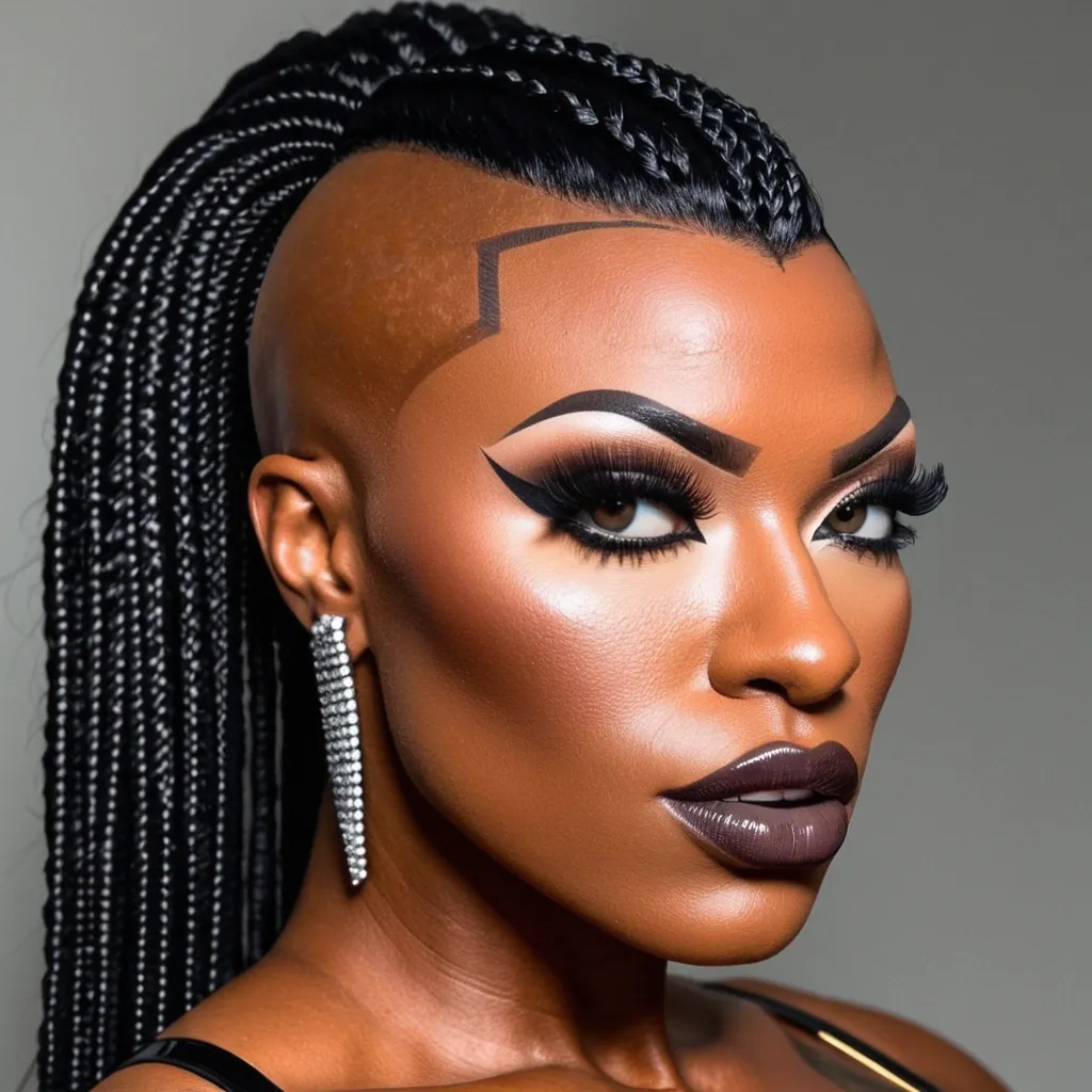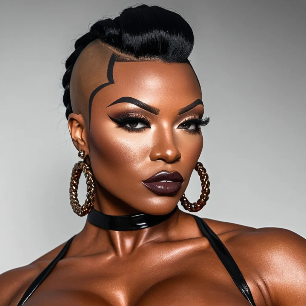 Generate Gorgeous female boss , very Dark-skinned african-American woman , bimbo , trimmed eyebrows pointy face , eyeliner , lipgloss , braided , mohawk designer , styled hair , bald on the side , black hair , bimbo , hourglass body , abnormally massive female bodybuilder , gorgeous , close up , full lips , big booty , redheaded , face and breast , feminine silhouette , too big breast , big booty , sexy thighs abs , silhouette , up close , flexing biceps , strikingly beautiful hazel eyes , legs are iconic and defining physical feature , both visually and in terms of combat ability.wearing an outfit that is a striking blend of elegance , power , and femininity , designed to command attention in any room. The suit is tailored to perfection , hugging the wearer’s curves with precision while emphasizing a structured silhouette. The fabric itself is a refined grey tweed patterned with subtle white grid lines , giving the suit a texture that feels both sophisticated and modern. The blazer features broad blue lapels and gold button accents , adding a luxurious touch that elevates the look beyond typical business attire. The matching high-waisted trousers elongate the frame , further enhancing the poised and commanding effect of the ensemble.The styling choices amplify the boldness of the suit. The inner blouse is a silky , greybutton-down shirt that complements the tweed’s tone while introducing a softer , feminine balance to the sharp tailoring of the jacket. The blouse peeks out neatly from under the blazer , maintaining elegance without drawing focus away from the suit’s commanding cut. Accessories are kept minimal yet intentional: a delicate layered gold necklace and hoop earrings that add glimmers of light and luxury without overpowering the outfit. The choice of voluminous , honey-brown braids cascading down her shoulders frames the face with both confidence and glamour , completing the commanding visual.Altogether , this look communicates a blend of authority and allure. It is business-ready yet fashion-forward , balancing corporate structure with vibrant femininity. The color palette blue , grey and gold avoids being overly delicate , instead embracing the richness of texture , structure , and presence. This is the kind of ensemble that speaks to ambition , sophistication , and personal style—ideal for someone who thrives in positions of influence but insists on expressing her individuality with bold elegance. It’s not just clothing—it’s a statement of power wrapped in grace. In luxury living legs that could crush a watermelon , skirt high boots are a bold and striking statement piece , crafted in glossy black patent leather that gives them a sleek , polished finish. Rising to just below the knee , the boots feature three adjustable buckle straps along the shaft , adding both edge and detail to their design. The towering stiletto heel , paired with a thick platform sole , creates an ultra-dramatic silhouette that elongates the leg and exudes power and confidence. With their combination of shine , height , and structure , these boots perfectly balance fierce femininity with high-fashion allure , stunning face ,