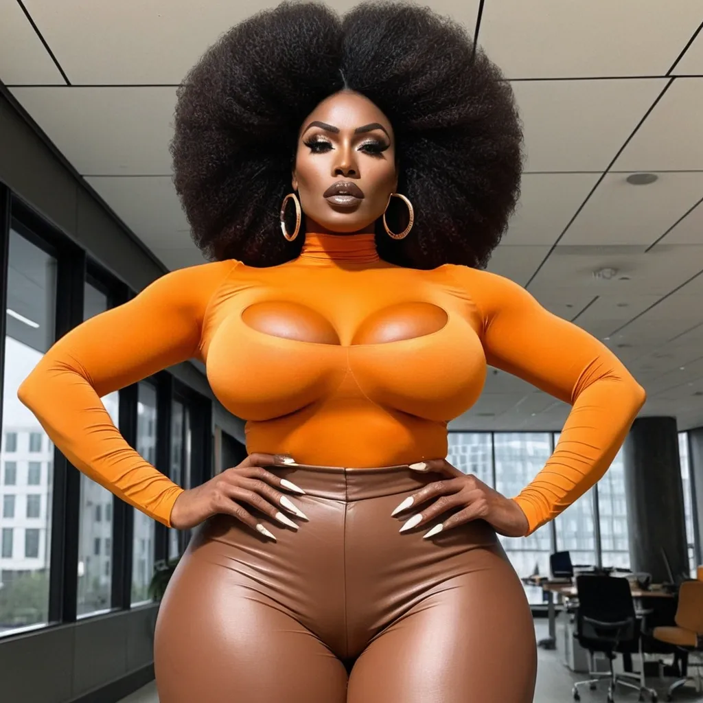 Generate Gorgeous 24 years old , 1970s female boss , dark-skinned African-American woman , pointy face , bimbo , hourglass body , abnormally massive female bodybuilder , gorgeous , close up , full lips , big booty , 1970s Afro stylish , hoop earrings feminine silhouette , too big breast , big booty , sexy thighs abs , silhouette , up close , flexing biceps , beautiful brown eyes , legs are iconic and defining physical feature , both visually and in terms of combat ability.wearing an outfit that is a striking blend of elegance , power , and femininity , designed to command attention in any room. The suit is tailored to perfection , hugging the wearer’s curves with precision while emphasizing a structured silhouette. The fabric itself is a refined grey tweed patterned with subtle white grid lines , giving the suit a texture that feels both sophisticated and modern. The blazer features broad blue lapels and gold button accents , adding a luxurious touch that elevates the look beyond typical business attire. The matching high-waisted trousers elongate the frame , further enhancing the poised and commanding effect of the ensemble.The styling choices amplify the boldness of the suit. The inner blouse is a silky , greybutton-down shirt that complements the tweed’s tone while introducing a softer , feminine balance to the sharp tailoring of the jacket. The blouse peeks out neatly from under the blazer , maintaining elegance without drawing focus away from the suit’s commanding cut. Accessories are kept minimal yet intentional: a delicate layered gold necklace and hoop earrings that add glimmers of light and luxury without overpowering the outfit. The choice of voluminous , honey-brown braids cascading down her shoulders frames the face with both confidence and glamour , completing the commanding visual.Altogether , this look communicates a blend of authority and allure. It is business-ready yet fashion-forward , balancing corporate structure with vibrant femininity. The color palette blue , grey and gold avoids being overly delicate , instead embracing the richness of texture , structure , and presence. This is the kind of ensemble that speaks to ambition , sophistication , and personal style—ideal for someone who thrives in positions of influence but insists on expressing her individuality with bold elegance. It’s not just clothing—it’s a statement of power wrapped in grace. In luxury living legs that could crush a watermelon , skirt high boots are a bold and striking statement piece , crafted in glossy black patent leather that gives them a sleek , polished finish. Rising to just below the knee , the boots feature three adjustable buckle straps along the shaft , adding both edge and detail to their design. The towering stiletto heel , paired with a thick platform sole , creates an ultra-dramatic silhouette that elongates the leg and exudes power and confidence. With their combination of shine , height , and structure , these boots perfectly balance fierce femininity with high-fashion allure. High cheekbones , prominent jawline , gorgeous big brown light hazel honey , , enormous breast , orange velvet t-shirt , gold futuristic necklace , grey designer pants in office building , enormous breast , enormous butt ,