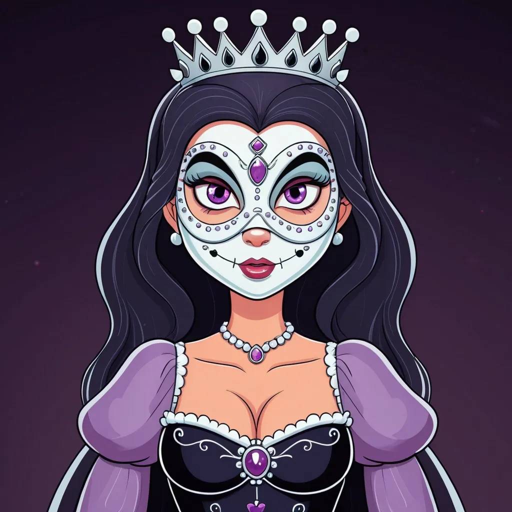 cartoon of a adult princess in long neon pink dress that glows she is wearing a spooky mask ,