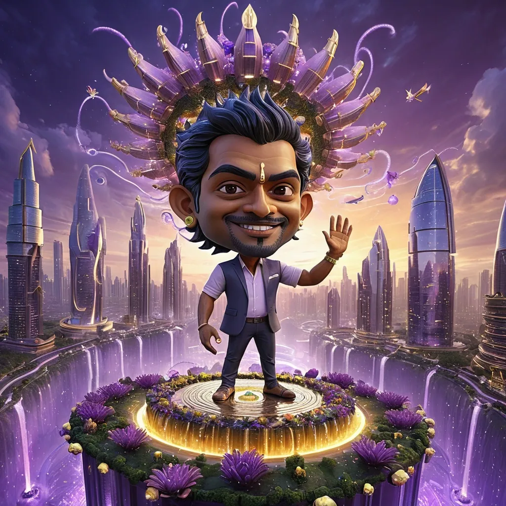 Here's the 3D big head caricature of the Indian man , this time waving from a dragon flying over futuristic vertical garden city where crystalline skyscrapers spiral toward purple storm clouds , its delicate antennae transmitting golden light beams that nurture floating botanical platforms teeming with bioluminescent flowers and cascading waterfalls that shimmer in the perpetual twilight of this utopian sky realm. ,