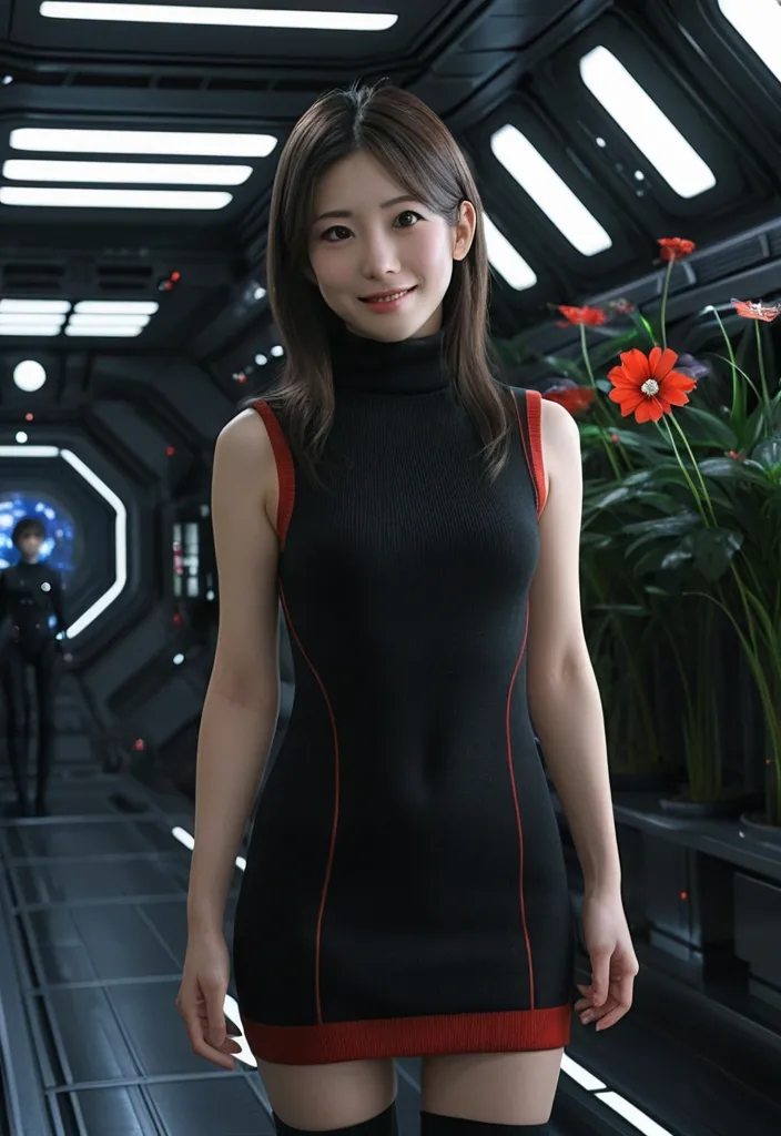 masterpiece photorealistic full lenght a beautiful japanese female with straight shoulder brown hair in her mid twenties in black and red turtleneck sleeveless zipper spandex mini sweaterdress , gentle smile a hand on her hip , standing in a futuristic luminous space station with japanese influence , some flowers and green plants , a bed in the room , science fiction cinematic style ,
