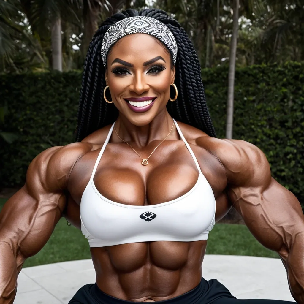 This woman is a striking African-American female bodybuilder whose deep , enormous massive woman , rich ebony skin tone glows with a warm , glossy sheen under the light , highlighting every curve and contour of her hyper-muscular physique. Her complexion is a flawless dark chocolate brown , smooth and radiant , with subtle highlights that accentuate the vascularity and separation in her massive deltoids , biceps , and pectorals. Her hair is styled in long , thick black braids that cascade down her back , partially gathered and secured by a patterned black-and-white paisley headband that sits snugly across her forehead , adding a touch of feminine flair to her otherwise powerfully masculine presentation.Her face is beautifully feminine despite the extreme muscularity , with high cheekbones , full lips curved into a bright , confident smile that reveals perfect white teeth , and large , expressive eyes framed by long lashes and subtly arched brows. Her eyes are a deep brown , sparkling with joy and self-assurance as she gazes slightly downward , giving her an approachable yet commanding presence. Delicate gold hoop earrings and a thin gold necklace with a small pendant draw attention to her elegant neck and collarbone , contrasting softly with the hardness of her traps and delts.She wears a tight white sports bra that struggles to contain her enormous , rounded pectoral muscles , which are so thick and developed that they push forward dramatically , creating a shelf-like appearance beneath the fabric. The bra’s material clings to every ridge and vein , with a small circular detail at the center drawing the eye to the deep separation between her pecs. Below , her midsection reveals a chiseled eight-pack of abs , each block sharply defined and separated by deep etchings. Her arms are colossal—biceps that peak like mountains , forearms thick with cable-like veins—and rest casually on her thighs , which are wrapped in dark navy leggings that stretch over quads so massive they force her knees apart even while seated. Every inch of her body screams power , yet her smile and soft accessories keep her radiating warmth and femininity. Enormous breast , enormous butt , in backyard , big 40in booty , too big breast ,