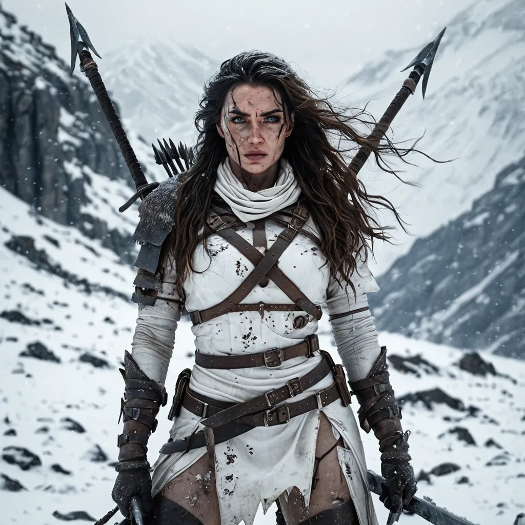 A battle-hardened female warrior stands in a snowy mountain battlefield , surrounded by torn flags , scattered weapons , and traces of recent combat. Cold wind blows through her long , wavy brunette hair , slightly damp and tousled from battle. She wears a soft white satin outfit wrapped tightly around her body , now visibly worn and damaged—frayed edges , dirt stains , and small tears from combat—but still functional and modest , with layered wraps and bindings providing coverage and support. Subtle leather straps and fur accents are added for practicality and warmth. Her skin shows signs of battle—light cuts , dirt , and dried blood—while her expression remains fierce and focused , with strong brows and determined eyes. She grips twin swords at her sides. Snow particles drift through the air , mixing with smoke and ash. Background: rugged snowy mountains , blurred battlefield chaos. Cinematic lighting with cold blue tones and soft highlights , ultra-realistic detail , sharp focus , dramatic depth of field --ar 9:16 --v 6 --q 2 ,