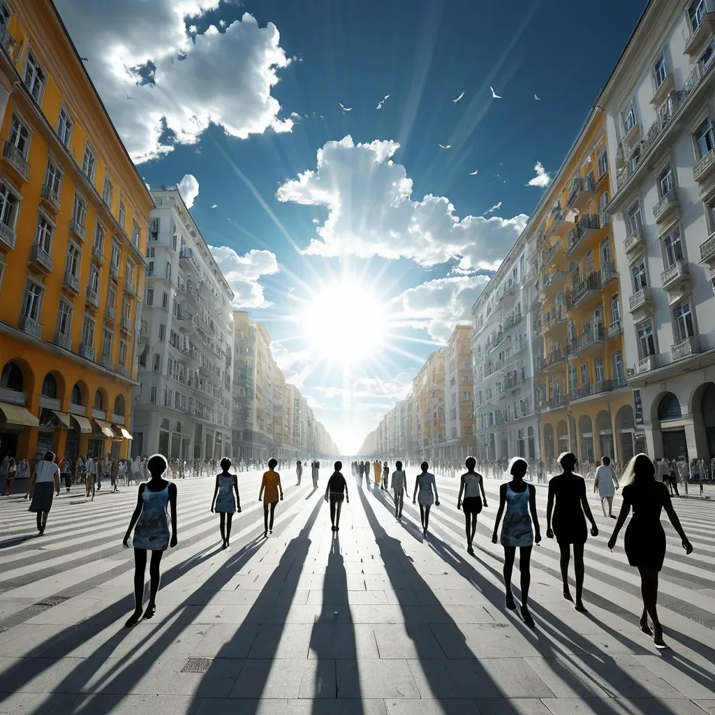 genera muchos seres con silueta humana esbeltos y hermosos , hechos completamente de imágenes reales de edificios modernistas mirada acogedora , en diferentes direcciones caminan por las calles hechas de nubes blancas , es verano hay un sol radiante en la calle como una esfera brillante , hay edificios pintados con imágenes de personas reales de distintas partes del planeta tierra , un mundo inverso , las motocicletas vuelan y hay nubes en cielo hechas de pavimento como el de una calle iluminada , fondo fusión de realidad y fantasía. ,
