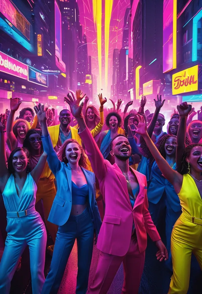 A vibrant , neon-drenched cityscape at night , bathed in the glow of a thousand lights , capturing the exhilarating essence of the "high life." A diverse group of stylish , joyful individuals with hands raised in celebration , embodying the spirit of "beautiful people" saying "go go go." Dynamic , energetic composition with a sense of forward momentum and endless possibility. Ultra-modern , hyperrealistic digital art with a dramatic color palette of electric blues , hot pinks , and bright yellows , inspired by the works of Alex Ross for his vibrant dynamism and Gerald Brom for his atmospheric lighting. Cinematic lighting , wide-angle lens , high-resolution. ar-9:16 ,