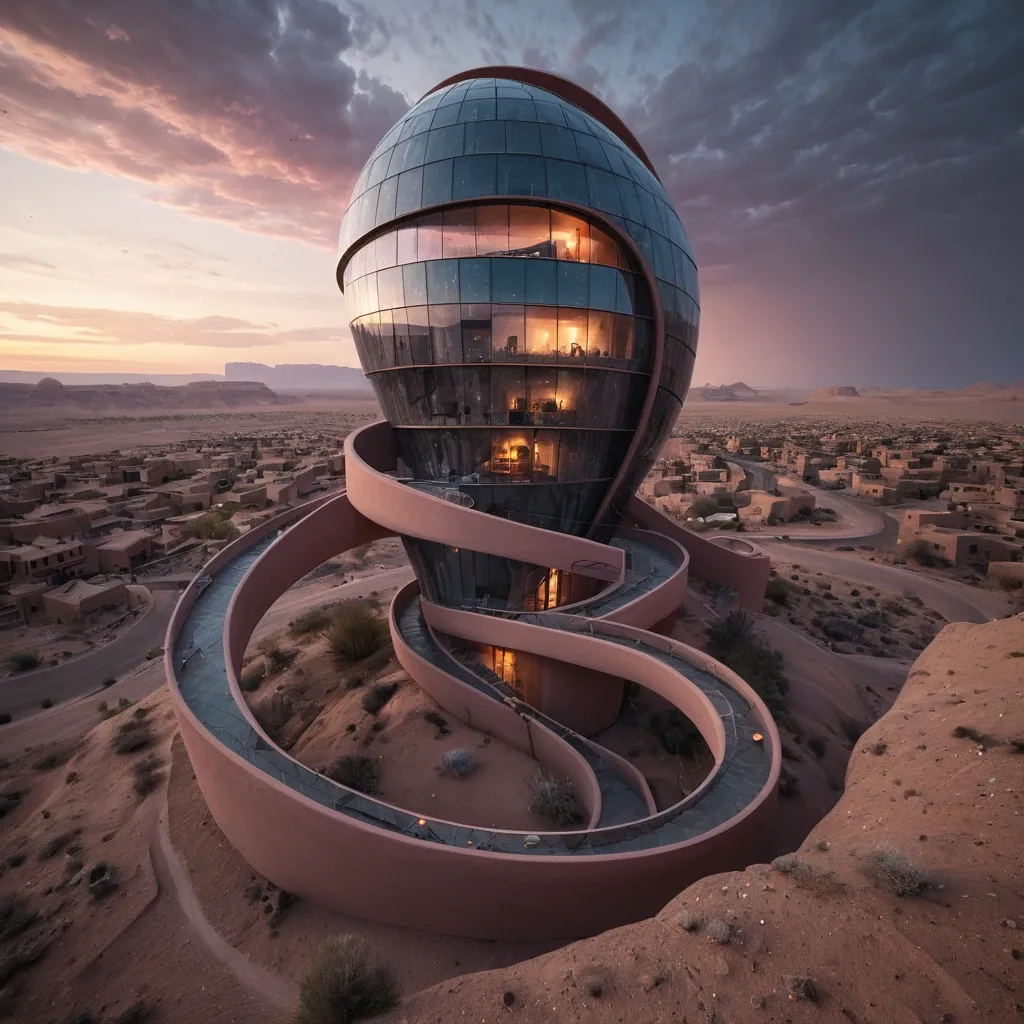 Bird's eye view , view from top , a Giant Wine Glass shaped , inspired by Restaurant architecture. A chaotic urban block with twisted geometric forms - skyscrapers bending into impossible angles , roads looping like möbius strips , and bridges connecting disjointed structures on middle of desert. A winding stone staircase leads from the desert to an open doorway , inviting viewers into the house. The landscape is illuminated by soft , ethereal light from a distant moon , casting a dreamy glow over the scene. The sky is rich with dark , brooding clouds , interspersed with bursts of soft pastel colors , suggesting the moments before sunset. A solitary tree leans against the structure , adding an organic touch among the surreal elements. ,