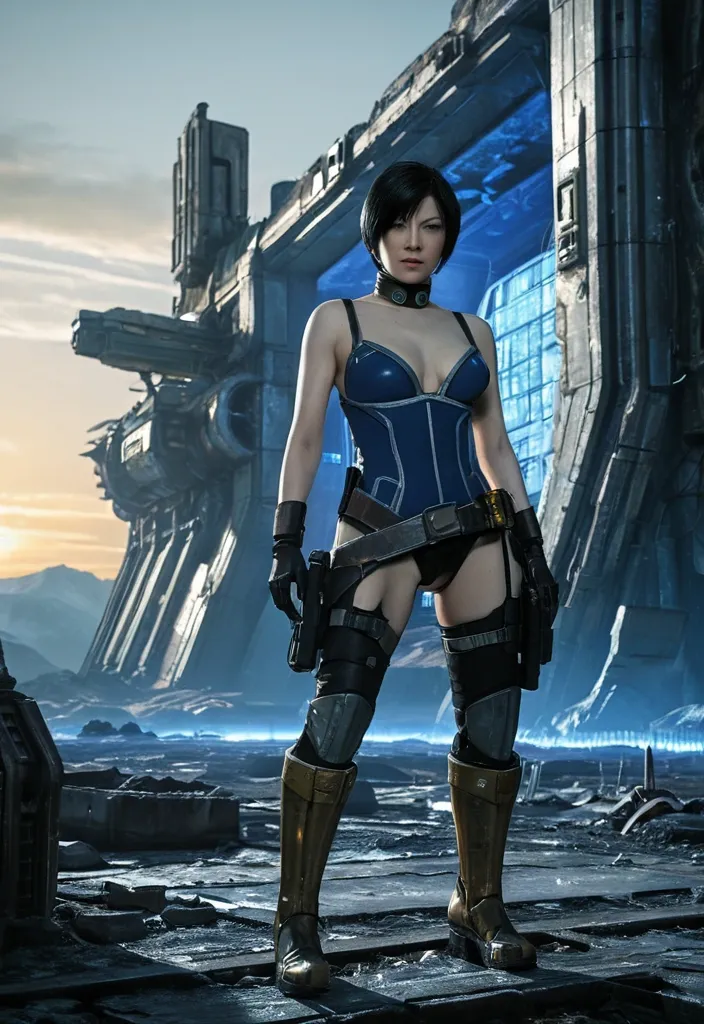 Ada Wong from Resident Evil (sci-fi) Remake. She has short , straight black hair , wears a milletry dress , Include her iconic black gloves , stockings and choker. She has a pistol , in a holster strapped to he upper leg , portrayed through Chrono-Luminal Echoes , where past , present , and future movements are simultaneously captured. Employ fading trails of sapphire blue light transitioning to golden yellow , suggesting the passage of time , makes maintenance on the devices of a large weathered sci-fi Spaceship inspired with blasters , resembling a blend of futuristic and vintage design , rests by elven ruins landscape at sunset. The Spaceship , featuring a silver and gray color scheme with signs of decay and ice crystals forming on its surface , exudes a sense of abandonment and mystery. ,
