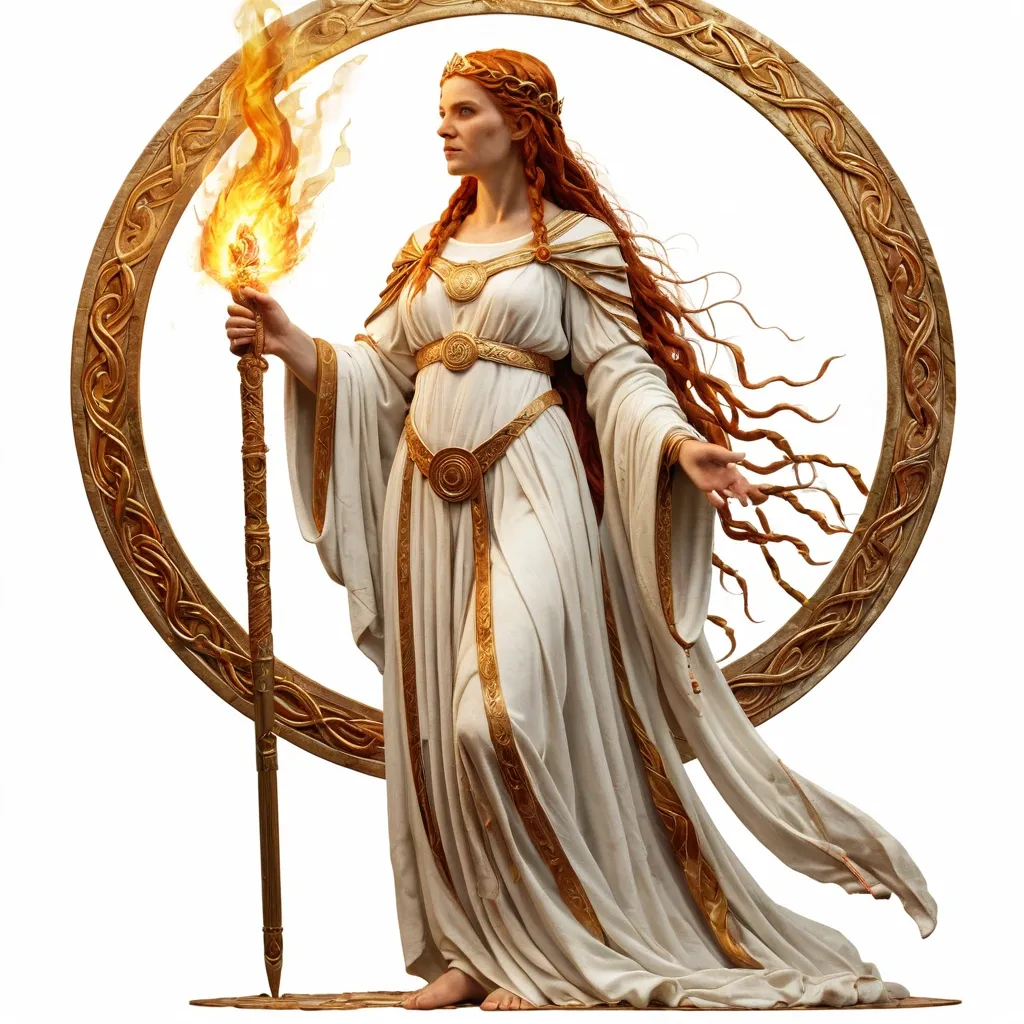 Celtic Goddess Bridget , radiant woman with braided red hair , wearing white and gold robes and a circlet of flame motifs , Style: hyperrealistic with a painterly texture , reminiscent of historical reconstruction art , detailed and atmospheric , Full body , Barefoot , Side View , 4K , White or Transparent Background. ,