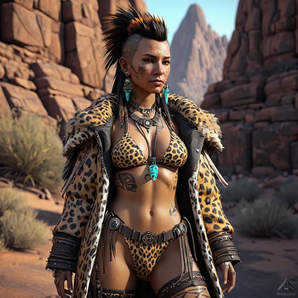 Female (~45) Character With Pinnacle Peak silhouette , Native Princess Full-Portrait with Mohawk and Neon Runes , a portrait of a Native American princess with a mohawk] [ATTIRE: Tribal Tailored Hand Made / Crafted Attire / Garb: PBR Materials + Textures: Marvelous Designer , Substance 3D - Designer & Painter: - Outer Garb Layer: Tiger-Fur-Textured Coat-Set - Inner Garb Layer: Leopard-Leather-Textured Bikini-Set.] [(Unreal Engine 5 Technologies: MetaHuman , Lumen , Megalights , Cinematic CGI FX , Ultra-Hyper-Detailed , 32K , 64-bit Color , 128MP Focus Depth , 256x Topaz Gigapixel AI Upscale , Watercolor-Ink-Oil Color-Pencil Street-Art Graffiti):2.0] ,