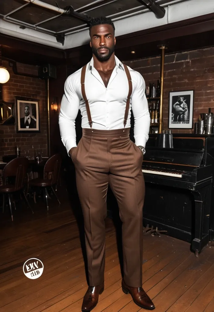 Generate ruggedly handsome dark-skinned African-American man abnormally massive male bodybuilder , , close up , full lips , big booty , brown , trimmed coarse hair , clean shaven big , muscular man , brown strikingly intense and alluring eyes , up close , flexing biceps , beautiful brown eyes , legs are iconic and defining physical feature , both visually and in terms of combat ability.wearing an outfit that is a striking blend of elegance , power , and femininity , designed to command attention in any room. The suit is tailored to perfection , hugging the wearer’s curves with precision while emphasizing a structured silhouette. The fabric itself is a refined grey tweed patterned with subtle white grid lines , giving the suit a texture that feels both sophisticated and modern. The blazer features broad blue lapels and gold button accents , adding a luxurious touch that elevates the look beyond typical business attire. The matching high-waisted trousers elongate the frame , further enhancing the poised and commanding effect of the ensemble.The styling choices amplify the boldness of the suit. The inner shirt is a silky , greybutton-down shirt that complements the tweed’s tone while introducing a masculine balance to the sharp tailoring of the jacket. The shirt peeks out neatly from under the blazer , maintaining elegance without drawing focus away from the suit’s commanding cut. Accessories are kept minimal yet intentional: a delicate layered gold necklace ad alpha leader of light and luxury without overpowering the outfit completing the commanding visual.Altogether , this look communicates a blend of authority and allure. It is business-ready yet fashion-forward , balancing corporate structure with vibrant femininity. The color palette blue , grey and gold avoids being overly delicate , instead embracing the richness of texture , structure , and presence. This is the kind of ensemble that speaks to ambition , sophistication , and personal style—ideal for someone who thrives in positions of influence but insists on expressing her individuality with bold elegance. It’s not just clothing—it’s a statement of power wrapped in grace. In luxury living legs that could crush a watermelon , skirt high boots are a bold and striking statement piece , crafted in glossy black patent leather that gives them a sleek , polished finish. Rising to just below the knee , the boots feature three adjustable buckle straps along the shaft , adding both edge and detail to their design. The towering stiletto heel , paired with a thick platform sole , creates an ultra-dramatic silhouette that elongates the leg and exudes power and confidence. With their combination of shine , height , and structure , these boots perfectly balance fierce femininity with high-fashion allure , dress shirt , suspenders and slacks in a 1940s jazz club ,