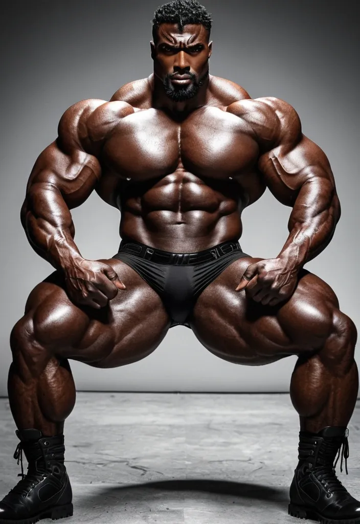 Generate ruggedly handsome dark-skinned African-American man abnormally massive male bodybuilder , , close up , full lips , big booty , black trimmed coarse hair , big , muscular man , brown strikingly intense and alluring eyes , up close , flexing biceps , beautiful brown eyes , legs are iconic and defining physical feature , both visually and in terms of combat ability.wearing an outfit that is a striking blend of elegance , power , and femininity , designed to command attention in any room. The suit is tailored to perfection , hugging the wearer’s curves with precision while emphasizing a structured silhouette. The fabric itself is a refined grey tweed patterned with subtle white grid lines , giving the suit a texture that feels both sophisticated and modern. The blazer features broad blue lapels and gold button accents , adding a luxurious touch that elevates the look beyond typical business attire. The matching high-waisted trousers elongate the frame , further enhancing the poised and commanding effect of the ensemble.The styling choices amplify the boldness of the suit. The inner shirt is a silky , greybutton-down shirt that complements the tweed’s tone while introducing a masculine balance to the sharp tailoring of the jacket. The shirt peeks out neatly from under the blazer , maintaining elegance without drawing focus away from the suit’s commanding cut. Accessories are kept minimal yet intentional: a delicate layered gold necklace ad alpha leader of light and luxury without overpowering the outfit completing the commanding visual.Altogether , this look communicates a blend of authority and allure. It is business-ready yet fashion-forward , balancing corporate structure with vibrant femininity. The color palette blue , grey and gold avoids being overly delicate , instead embracing the richness of texture , structure , and presence. This is the kind of ensemble that speaks to ambition , sophistication , and personal style—ideal for someone who thrives in positions of influence but insists on expressing her individuality with bold elegance. It’s not just clothing—it’s a statement of power wrapped in grace. In luxury living legs that could crush a watermelon , skirt high boots are a bold and striking statement piece , crafted in glossy black patent leather that gives them a sleek , polished finish. Rising to just below the knee , the boots feature three adjustable buckle straps along the shaft , adding both edge and detail to their design. The towering stiletto heel , paired with a thick platform sole , creates an ultra-dramatic silhouette that elongates the leg and exudes power and confidence. With their combination of shine , height , and structure , these boots perfectly balance fierce femininity with high-fashion allure , ,