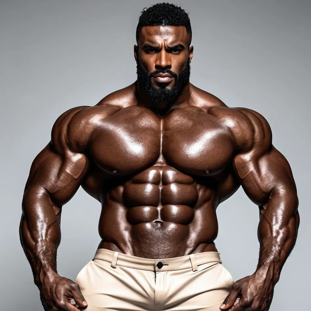 Generate ruggedly handsome , thick sideburns chops , dark-skinned African-American man abnormally massive male bodybuilder , , close up , full lips , big booty , black trimmed coarse hair , big , muscular man , brown strikingly intense and alluring eyes , up close , flexing biceps , gorgeous brown eyes , legs are iconic and defining physical feature , both visually and in terms of combat ability.wearing an outfit that is a striking blend of elegance , power , and femininity , designed to command attention in any room. The suit is tailored to perfection , hugging the wearer’s curves with precision while emphasizing a structured silhouette. The fabric itself is a refined grey tweed patterned with subtle white grid lines , giving the suit a texture that feels both sophisticated and modern. The blazer features broad blue lapels and gold button accents , adding a luxurious touch that elevates the look beyond typical business attire. The matching high-waisted trousers elongate the frame , further enhancing the poised and commanding effect of the ensemble.The styling choices amplify the boldness of the suit. The inner shirt is a silky , greybutton-down shirt that complements the tweed’s tone while introducing a masculine balance to the sharp tailoring of the jacket. The shirt peeks out neatly from under the blazer , maintaining elegance without drawing focus away from the suit’s commanding cut. Accessories are kept minimal yet intentional: a delicate layered gold necklace ad alpha leader of light and luxury without overpowering the outfit completing the commanding visual.Altogether , this look communicates a blend of authority and allure. It is business-ready yet fashion-forward , balancing corporate structure with vibrant femininity. The color palette blue , grey and gold avoids being overly delicate , instead embracing the richness of texture , structure , and presence. This is the kind of ensemble that speaks to ambition , sophistication , and personal style—ideal for someone who thrives in positions of influence but insists on expressing her individuality with bold elegance. It’s not just clothing—it’s a statement of power wrapped in grace. In luxury living legs that could crush a watermelon , skirt high boots are a bold and striking statement piece , crafted in glossy black patent leather that gives them a sleek , polished finish. Rising to just below the knee , the boots feature three adjustable buckle straps along the shaft , adding both edge and detail to their design. The towering stiletto heel , paired with a thick platform sole , creates an ultra-dramatic silhouette that elongates the leg and exudes power and confidence. With their combination of shine , height , and structure , these boots perfectly balance fierce femininity with high-fashion allure , blue and beige design pattern dress shirt , beige pants , thick sideburns chops , clean shaven ,