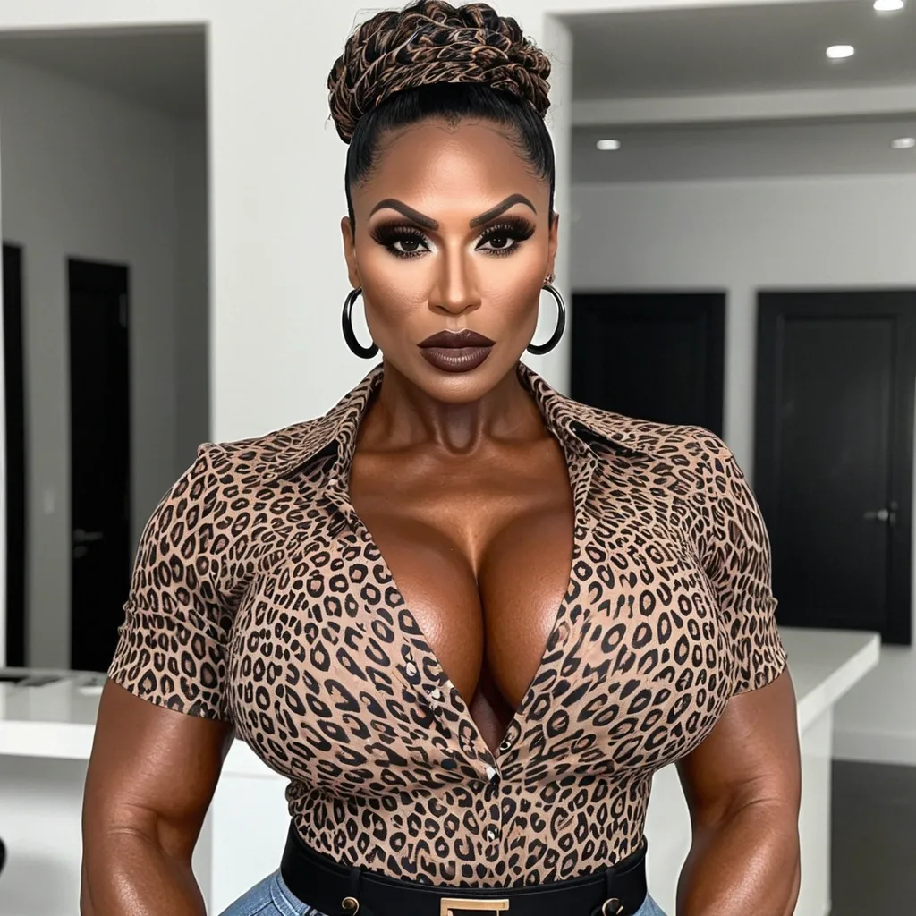 Generate Gorgeous female boss , bimbo , 34 years old , very dark-skinned African-American woman , , gorgeous hazel eyes , hourglass body , abnormally massive female bodybuilder , gorgeous , close up , full lips , big booty , brown pixie updo hair , short hair , feminine silhouette , too big breast , big booty , sexy thighs abs , silhouette , up close , flexing biceps , beautiful brown eyes , legs are iconic and defining physical feature , both visually and in terms of combat ability.wearing an outfit that is a striking blend of elegance , power , and femininity , designed to command attention in any room. The suit is tailored to perfection , hugging the wearer’s curves with precision while emphasizing a structured silhouette. The fabric itself is a refined grey tweed patterned with subtle white grid lines , giving the suit a texture that feels both sophisticated and modern. The blazer features broad blue lapels and gold button accents , adding a luxurious touch that elevates the look beyond typical business attire. The matching high-waisted trousers elongate the frame , further enhancing the poised and commanding effect of the ensemble.The styling choices amplify the boldness of the suit. The inner blouse is a silky , greybutton-down shirt that complements the tweed’s tone while introducing a softer , feminine balance to the sharp tailoring of the jacket. The blouse peeks out neatly from under the blazer , maintaining elegance without drawing focus away from the suit’s commanding cut. Accessories are kept minimal yet intentional: a delicate layered gold necklace and hoop earrings that add glimmers of light and luxury without overpowering the outfit. The choice of voluminous , honey-brown braids cascading down her shoulders frames the face with both confidence and glamour , completing the commanding visual.Altogether , this look communicates a blend of authority and allure. It is business-ready yet fashion-forward , balancing corporate structure with vibrant femininity. The color palette blue , grey and gold avoids being overly delicate , instead embracing the richness of texture , structure , and presence. This is the kind of ensemble that speaks to ambition , sophistication , and personal style—ideal for someone who thrives in positions of influence but insists on expressing her individuality with bold elegance. It’s not just clothing—it’s a statement of power wrapped in grace. In luxury living legs that could crush a watermelon , skirt high boots are a bold and striking statement piece , crafted in glossy black patent leather that gives them a sleek , polished finish. Rising to just below the knee , the boots feature three adjustable buckle straps along the shaft , adding both edge and detail to their design. The towering stiletto heel , paired with a thick platform sole , creates an ultra-dramatic silhouette that elongates the leg and exudes power and confidence. With their combination of shine , height , and structure , these boots perfectly balance fierce femininity with high-fashion allure. High cheekbones , prominent jawline , gorgeous big brown eyes , freckles , enormous breast , bluish gray and black chevrons designed dress work shirt , cheetah print top and denim shorts , ,