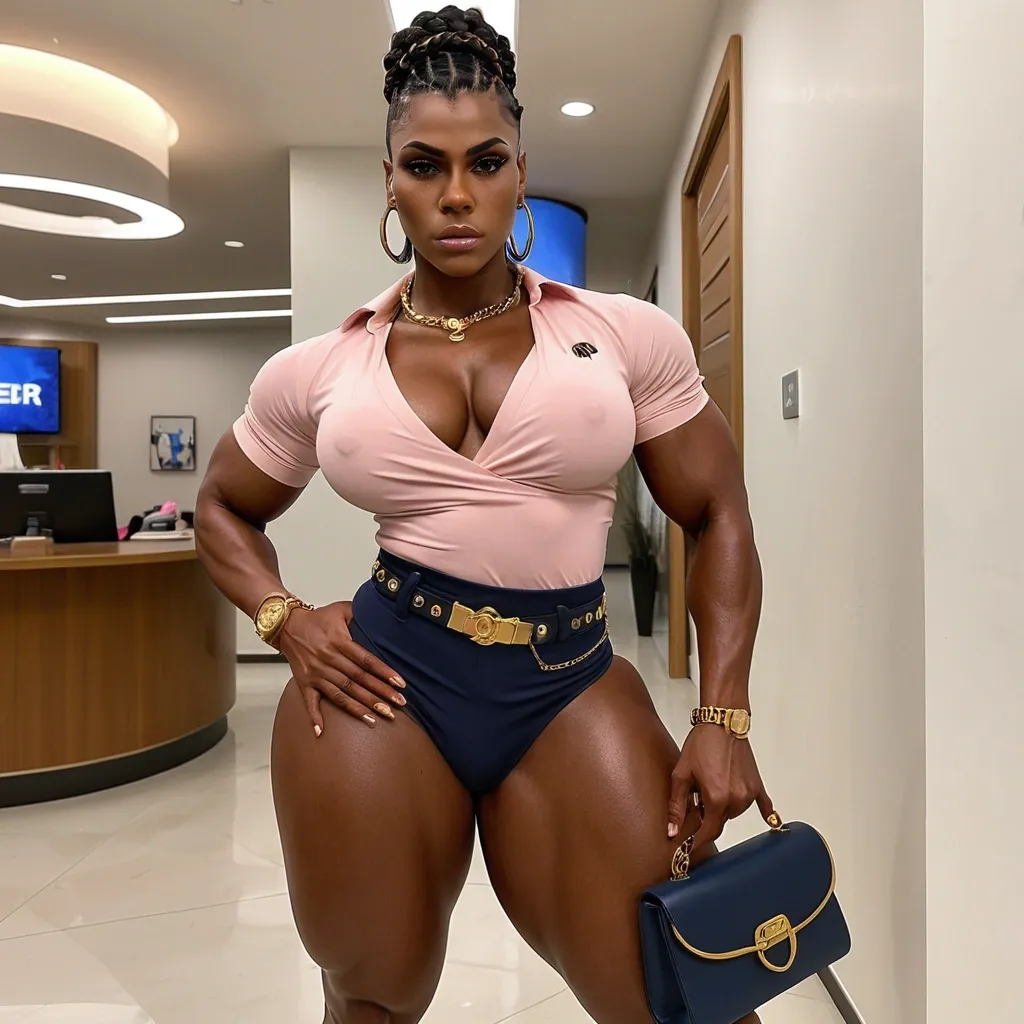 Adrienne-Joi Johnson face , African-American dark-skinned woman , pony face prominent jawline Gorgeous female boss , abnormally massive female bodybuilder , gorgeous , Close up , full lips , big booty , hair stylish design braided mohawk , hair , feminine silhouette , too big breast , beautiful brown eyes , brown big booty , curvy hips , toned legs , Wearing a stylish and cohesive look with a soft pink top that complements a high-waisted , dark navy skirt with a prominent gold belt buckle , adding a touch of elegance. The ensemble is accessorized with large pink hoop earrings , a gold necklace with a “Mother” pendant , multiple gold bangles , and a matching pink handbag , creating a vibrant and coordinated appearance. The long , braided hair in a warm brown tone enhances the overall aesthetic , while the setting inside a corporate t suggests a casual yet fashionable meeting. This combination of colors and accessories reflects a bold yet harmonious fashion choice , standing inside a fancy work environment , enormous butt , enormous breast ,