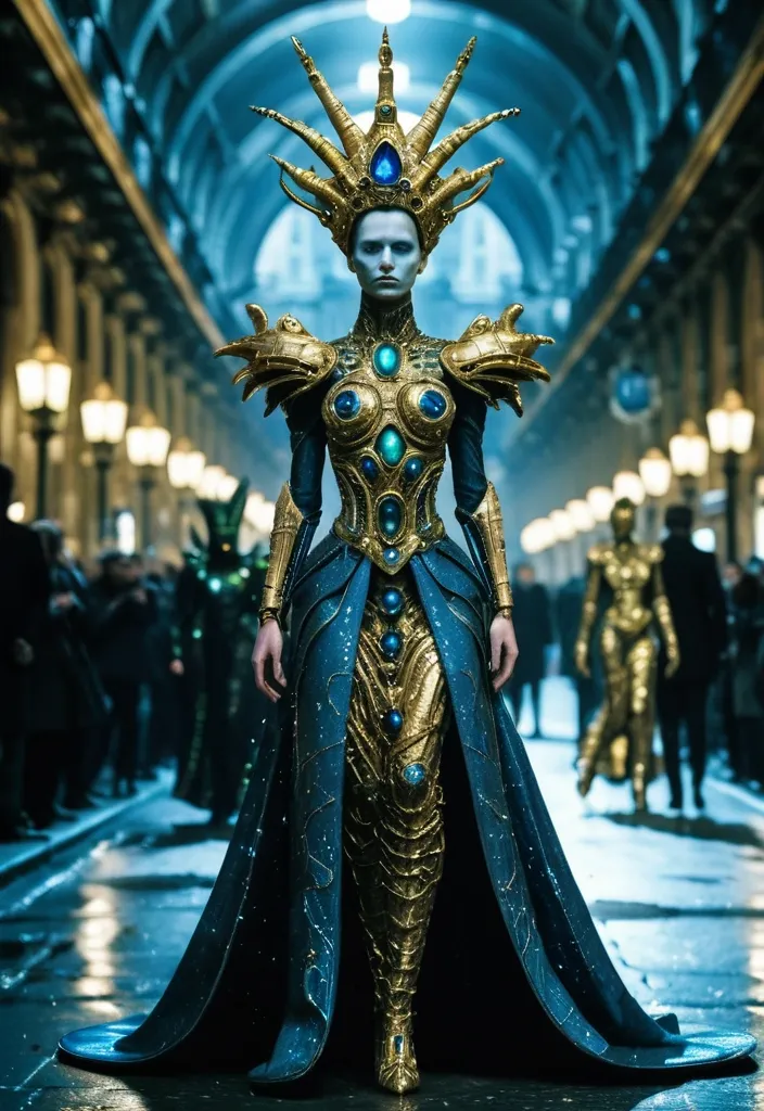 A majestic Xenomorph Queen in an avant-garde haute couture gown , fair skin , digital-blue eyes , on head ornate , golden crown encrusted with emeralds and sapphires , strutting down a Parisian catwalk. The scene is illuminated by dramatic spotlights , casting long shadows. The background is a blur of glittering city lights and an audience of blurred silhouettes. Photorealism with a surreal , fashion-editorial twist. Inspired by the dramatic compositions of Helmut Newton and the fantastical elements of Zdzisław Beksiński. ,