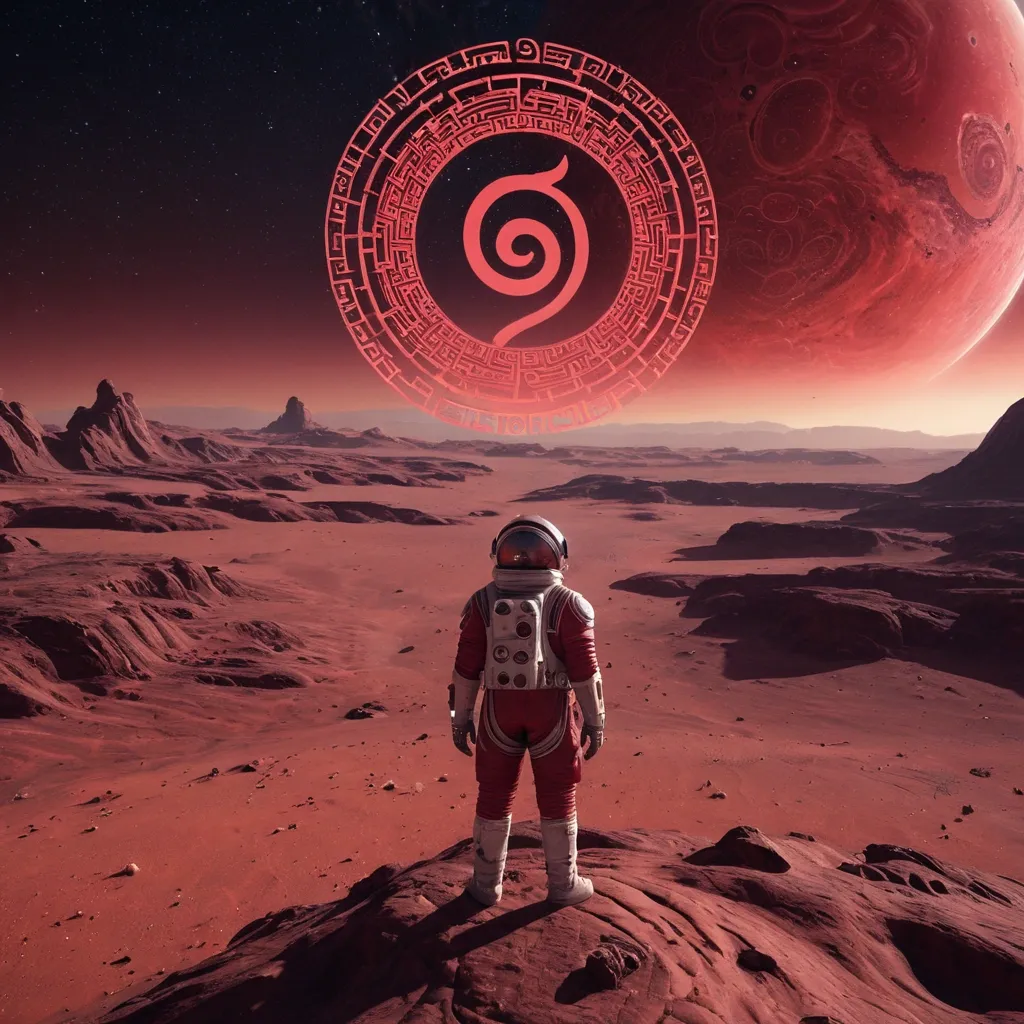 A lone astronaut standing on a desolate , crimson desert planet , gazing up at a swirling text "ॐ" is a sacred syllable , mantra , and spiritual symbol in Hinduism , that dominates the night sky. In the distance , monolithic , geometric structures of an unknown alien civilization pierce the horizon. The scene evokes a sense of profound isolation and the immensity of cosmic history. Rendered in a hyper-realistic , cinematic style with an emphasis on vast landscapes and dramatic lighting. ,