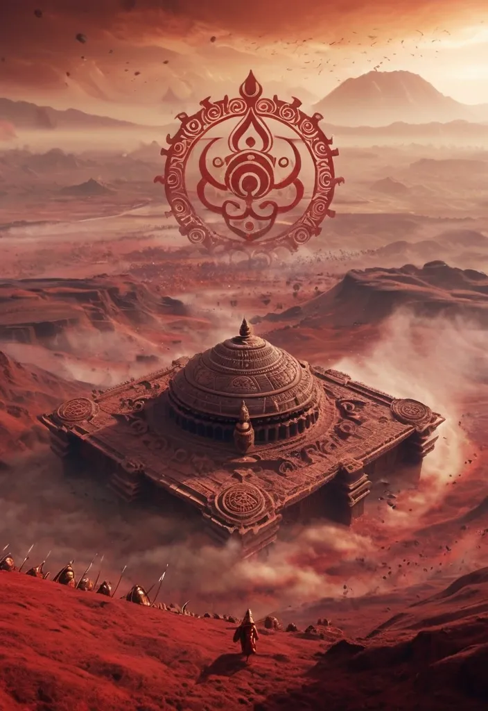 Battle of Mahabharata , 1600 , eye-level amid samurai formations clashing in misty autumn fields , banners streaming , armor gleaming through drifting smoke , distant hills veiled by rain , crimson desert planet , gazing up at a swirling text "ॐ" is a sacred syllable , mantra , and spiritual symbol in Hinduism , that dominates the night sky. In the distance , monolithic , geometric structures of a Hinduism civilization pierce the horizon. Style: Matte Painting , detailed and atmospheric , Eye-level view , Full scene , 4K ,