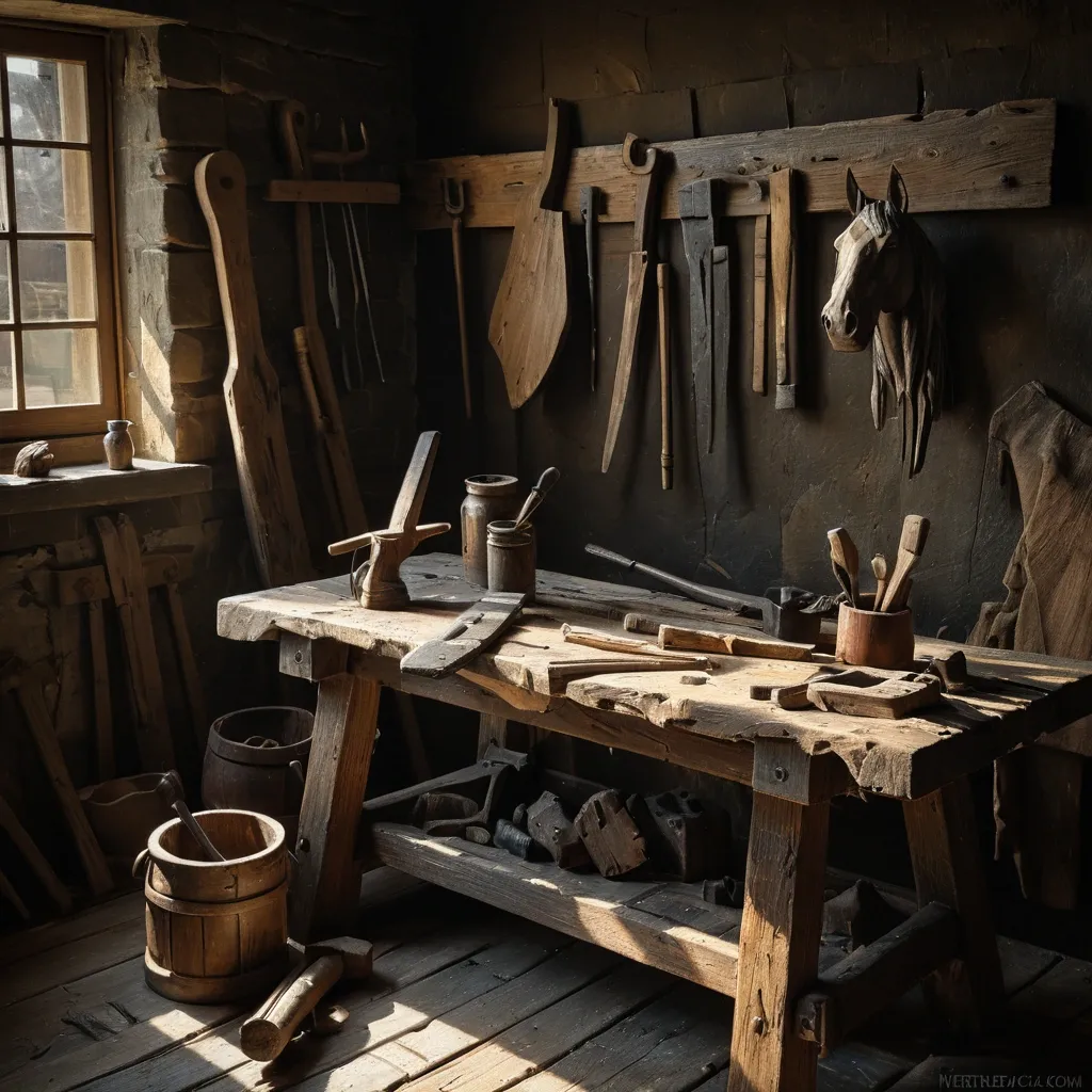 A rustic still life of weathered tools and a half-finished horse wooden sculpture on a rough-hewn workbench. Thick , impasto oil paint is used , with visible brushstrokes creating texture and depth. The lighting is dramatic , casting long shadows and highlighting the tactile quality of the materials. The style is akin to Dutch Masters still life paintings , emphasizing materiality and slow creation. ,