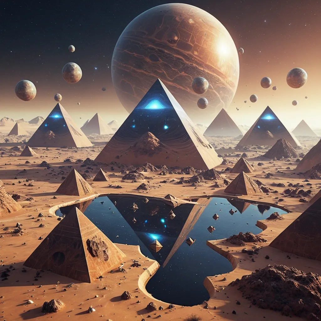 Bird's eye view , view from top , a inverted kingdom of caves shaped like a pyramid. A chaotic caves with twisted geometric forms - caves bending into impossible mountains rises from the Tora Bora mountains , Afghanistan , a Toyota Tacoma stand on roads looping like möbius strips , and bridges connecting disjointed structures that floating on middle of mountain , its apex balanced in the earth , its base pointing towards the starry evening sky , a mystical , ancient wonder born from the sands of time. ,