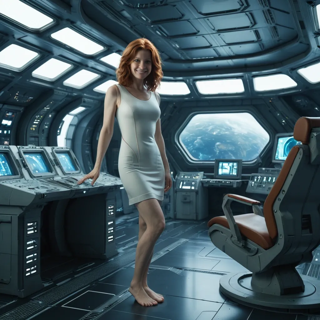 masterpiece photoralistic full lenght , an european pale female with wavy shoulder auburn hair in her mid thirties gentle smile , wearing opened wide zipper short purple and black spandex minidress , barefoot , is standing up next a chair in a control room of a futuristic spaceship , some computers and window , through the windows , space and planet cinematic style ,