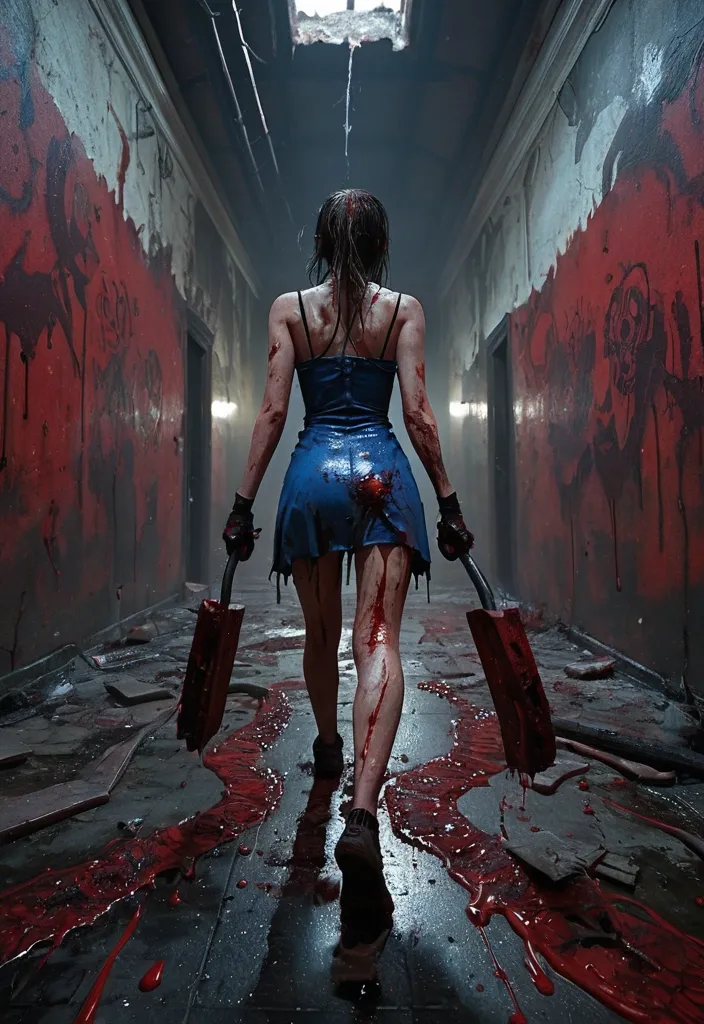 From behind of a Female figure running while Holding a large blood-splattered chainsaw. She is wearing a cracked , bloodstained porcelain mask with Torn form-fitting blue latex short dress smeared with blood and grime , pale strong thighs running in Abandoned castle corridor , flickering overhead red candles , rusted paintings with blood crimson mandala , peeling walls with puffing dust , scattered chains and debris , many blood trails on floor , dark fog curling around her feet. Dynamic low-angle composition , cinematic lighting , deep shadows contrasted with harsh highlights , hyper-detailed textures , grotesque and macabre , survival horror atmosphere , nightmarish , intensely creepy. graffiti art , splash art , street art , spray paint , oil gouache melting , acrylic , high contrast , colorful polychromatic , ultra detailed , ultra quality , CGSociety ,
