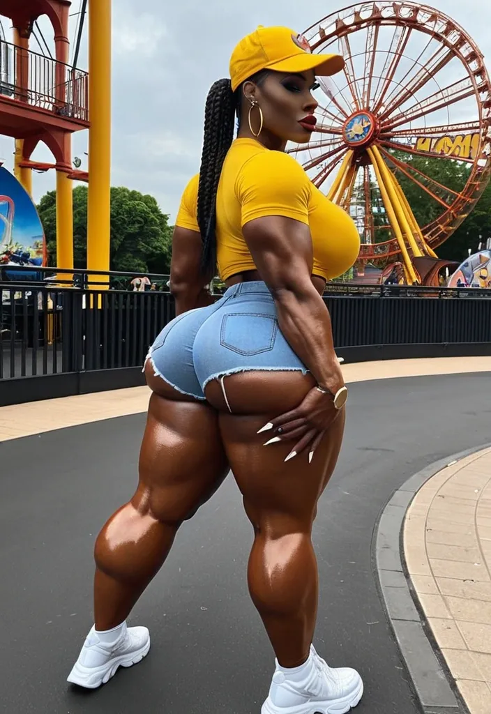 Generate Gorgeous female boss , bimbo , dark-skinned very African-American female , hourglass body , abnormally massive female bodybuilder , gorgeous , close up , full lips , big booty , brown , ponytail braids , on face and breast , short pixie hair , shaved on the side , feminine silhouette , too big breast , big booty , sexy thighs abs , silhouette , up close , flexing biceps , beautiful green eyes , legs are iconic and defining physical feature , both visually and in terms of combat ability.wearing an outfit that is a striking blend of elegance , power , and femininity , designed to command attention in any room. The suit is tailored to perfection , hugging the wearer’s curves with precision while emphasizing a structured silhouette. The fabric itself is a refined grey tweed patterned with subtle white grid lines , giving the suit a texture that feels both sophisticated and modern. The blazer features broad blue lapels and gold button accents , adding a luxurious touch that elevates the look beyond typical business attire. The matching high-waisted trousers elongate the frame , further enhancing the poised and commanding effect of the ensemble.The styling choices amplify the boldness of the suit. The inner blouse is a silky , greybutton-down shirt that complements the tweed’s tone while introducing a softer , feminine balance to the sharp tailoring of the jacket. The blouse peeks out neatly from under the blazer , maintaining elegance without drawing focus away from the suit’s commanding cut. Accessories are kept minimal yet intentional: a delicate layered gold necklace and hoop earrings that add glimmers of light and luxury without overpowering the outfit. The choice of voluminous , honey-brown braids cascading down her shoulders frames the face with both confidence and glamour , completing the commanding visual.Altogether , this look communicates a blend of authority and allure. It is business-ready yet fashion-forward , balancing corporate structure with vibrant femininity. The color palette blue , grey and gold avoids being overly delicate , instead embracing the richness of texture , structure , and presence. This is the kind of ensemble that speaks to ambition , sophistication , and personal style—ideal for someone who thrives in positions of influence but insists on expressing her individuality with bold elegance. It’s not just clothing—it’s a statement of power wrapped in grace. In luxury living legs that could crush a watermelon , skirt high boots are a bold and striking statement piece , crafted in glossy black patent leather that gives them a sleek , polished finish. Rising to just below the knee , the boots feature three adjustable buckle straps along the shaft , adding both edge and detail to their design. The towering stiletto heel , paired with a thick platform sole , creates an ultra-dramatic silhouette that elongates the leg and exudes power and confidence. With their combination of shine , height , and structure , these boots perfectly balance fierce femininity with high-fashion allure. High cheekbones , prominent jawline , gorgeous big light reflecting hazel eyes , enormous breast , cartoon bunny on yellow t-shirt-shirt , denim shorts , denim baseball cap walking in amusement park , full body profile shot , enormous butt , enormous breast , thunder thighs and hips ,