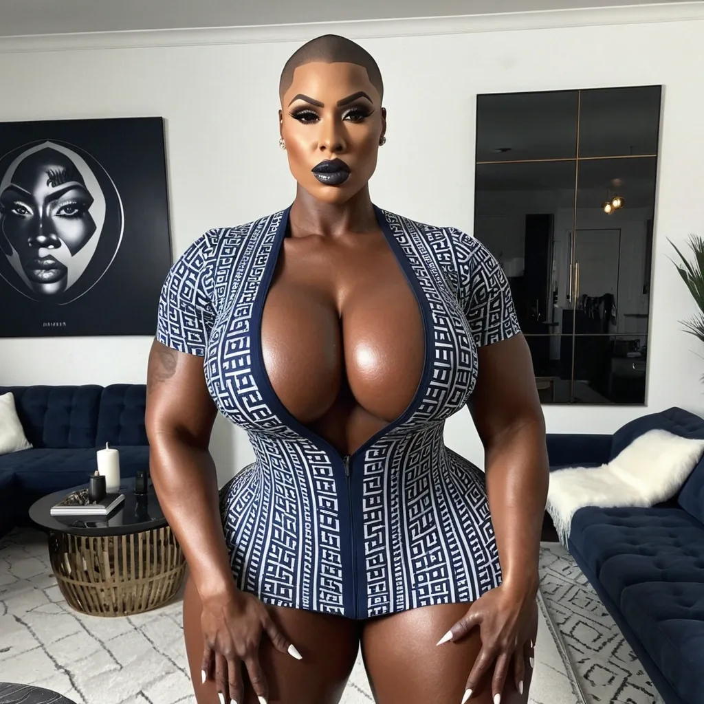 Generate Gorgeous female boss , bimbo , very dark-skinned African-American woman , buzz cut , pixie hair , hourglass body , abnormally massive female bodybuilder , gorgeous , close up , full lips , big booty , dark brown eyes , very big plump lips , feminine silhouette , too big breast , big booty , sexy thighs abs , silhouette , up close , flexing biceps , big gorgeous light brown eyes , legs are iconic and defining physical feature , both visually and in terms of combat ability.wearing an outfit that is a striking blend of elegance , power , and femininity , designed to command attention in any room. The suit is tailored to perfection , hugging the wearer’s curves with precision while emphasizing a structured silhouette. The fabric itself is a refined grey tweed patterned with subtle white grid lines , giving the suit a texture that feels both sophisticated and modern. The blazer features broad blue lapels and gold button accents , adding a luxurious touch that elevates the look beyond typical business attire. The matching high-waisted trousers elongate the frame , further enhancing the poised and commanding effect of the ensemble.The styling choices amplify the boldness of the suit. The inner blouse is a silky , greybutton-down shirt that complements the tweed’s tone while introducing a softer , feminine balance to the sharp tailoring of the jacket. The blouse peeks out neatly from under the blazer , maintaining elegance without drawing focus away from the suit’s commanding cut. Accessories are kept minimal yet intentional: a delicate layered gold necklace and hoop earrings that add glimmers of light and luxury without overpowering the outfit. The choice of voluminous , honey-brown braids cascading down her shoulders frames the face with both confidence and glamour , completing the commanding visual.Altogether , this look communicates a blend of authority and allure. It is business-ready yet fashion-forward , balancing corporate structure with vibrant femininity. The color palette blue , grey and gold avoids being overly delicate , instead embracing the richness of texture , structure , and presence. This is the kind of ensemble that speaks to ambition , sophistication , and personal style—ideal for someone who thrives in positions of influence but insists on expressing her individuality with bold elegance. It’s not just clothing—it’s a statement of power wrapped in grace. In luxury living legs that could crush a watermelon , skirt high boots are a bold and striking statement piece , crafted in glossy black patent leather that gives them a sleek , polished finish. Rising to just below the knee , the boots feature three adjustable buckle straps along the shaft , adding both edge and detail to their design. The towering stiletto heel , paired with a thick platform sole , creates an ultra-dramatic silhouette that elongates the leg and exudes power and confidence. With their combination of shine , height , and structure , these boots perfectly balance fierce femininity with high-fashion allure. Massive breast , massive cleavage , driving and standing in living room , wearing a white , dark navy blue and black accented subtle symmetrical patterned t-shirt , massive cleavage , black thong , enormous butt ,