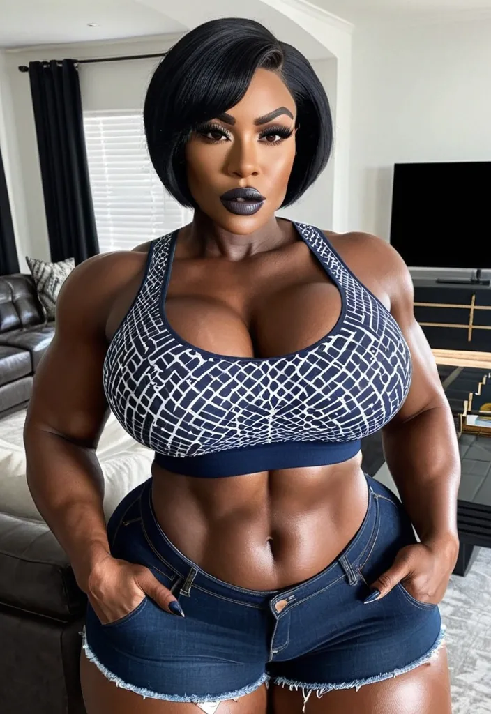 Generate Gorgeous female boss , bimbo , very dark-skinned African-American woman , short , pixie hair , hourglass body , abnormally massive female bodybuilder , gorgeous , close up , full lips , big booty , dark brown eyes , very big plump lips , feminine silhouette , too big breast , big booty , sexy thighs abs , silhouette , up close , flexing biceps , big gorgeous light brown eyes , legs are iconic and defining physical feature , both visually and in terms of combat ability.wearing an outfit that is a striking blend of elegance , power , and femininity , designed to command attention in any room. The suit is tailored to perfection , hugging the wearer’s curves with precision while emphasizing a structured silhouette. The fabric itself is a refined grey tweed patterned with subtle white grid lines , giving the suit a texture that feels both sophisticated and modern. The blazer features broad blue lapels and gold button accents , adding a luxurious touch that elevates the look beyond typical business attire. The matching high-waisted trousers elongate the frame , further enhancing the poised and commanding effect of the ensemble.The styling choices amplify the boldness of the suit. The inner blouse is a silky , greybutton-down shirt that complements the tweed’s tone while introducing a softer , feminine balance to the sharp tailoring of the jacket. The blouse peeks out neatly from under the blazer , maintaining elegance without drawing focus away from the suit’s commanding cut. Accessories are kept minimal yet intentional: a delicate layered gold necklace and hoop earrings that add glimmers of light and luxury without overpowering the outfit. The choice of voluminous , honey-brown braids cascading down her shoulders frames the face with both confidence and glamour , completing the commanding visual.Altogether , this look communicates a blend of authority and allure. It is business-ready yet fashion-forward , balancing corporate structure with vibrant femininity. The color palette blue , grey and gold avoids being overly delicate , instead embracing the richness of texture , structure , and presence. This is the kind of ensemble that speaks to ambition , sophistication , and personal style—ideal for someone who thrives in positions of influence but insists on expressing her individuality with bold elegance. It’s not just clothing—it’s a statement of power wrapped in grace. In luxury living legs that could crush a watermelon , skirt high boots are a bold and striking statement piece , crafted in glossy black patent leather that gives them a sleek , polished finish. Rising to just below the knee , the boots feature three adjustable buckle straps along the shaft , adding both edge and detail to their design. The towering stiletto heel , paired with a thick platform sole , creates an ultra-dramatic silhouette that elongates the leg and exudes power and confidence. With their combination of shine , height , and structure , these boots perfectly balance fierce femininity with high-fashion allure. Massive breast , massive cleavage , driving and standing in living room , wearing a white , dark navy blue and black accented subtle symmetrical patterned t-shirt , black denim shorts , enormous butt ,