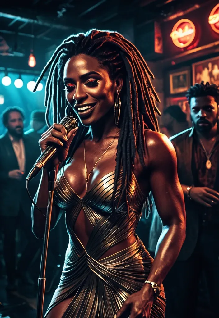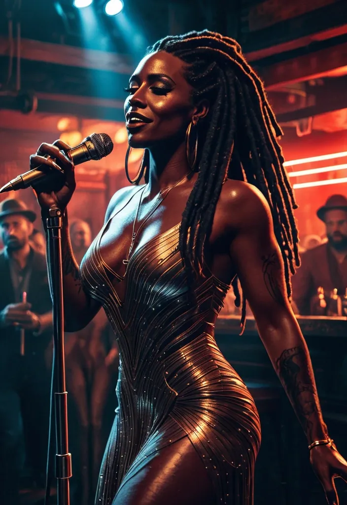 Artstation , Drawing , Graphite , Charcoal Art , "Music Video Illustration: A dimly lit , crowded blues bar pulsates with energy. On a small stage , a woman with dark skin , long dark dreadlocks , and piercing red eyes sings with soulful passion into a vintage microphone. She wears a glittering dress that catches the light , and her expression is a captivating blend of vulnerability and power. Across the room , partially obscured by the throng of patrons , a handsome man with dark skin , dreadlocks , and striking light eyes watches her with a warm , knowing smile. He leans against the bar , a drink in hand , his gaze fixed on her. The bar is packed with people , a mix of faces and styles , all bathed in the warm glow of the stage lights and the flickering neon signs. Instruments gleam in the background , and smoke hangs in the air. The style is gritty and realistic , with a touch of artistic flair. The color palette is rich and warm , with deep blues , reds , and golds dominating. The overall mood should evoke a sense of nostalgia , longing , and the intoxicating atmosphere of a classic blues club. This illustration is intended to be part of a music video , so consider dynamic composition and visual storytelling." , "The singer is a captivating presence , a woman with dark skin , long , intricately styled dark dreadlocks , and striking red eyes – not glowing , but naturally and intensely red – that seem to hold a lifetime of stories. Her features are striking and expressive , capable of conveying a wide range of emotions with subtle shifts in expression. She possesses a natural grace and confidence that commands attention. She is wearing a shimmering , form-fitting dress that accentuates her curves and catches the light with every movement. Large gold hoop earrings dangle from her ears , adding a touch of glamour to her look. Her voice is powerful and soulful , filled with a raw emotion that resonates with the audience. She moves with a natural rhythm and passion , fully immersed in the music. She is a blues siren , a captivating performer who embodies the spirit of the genre." , "He is a handsome man with dark skin , neatly styled dreadlocks , and striking light eyes that stand out in the dimly lit bar. His features are strong and expressive , conveying a sense of quiet strength and warmth. He has a subtle , knowing smile that hints at a shared history with the singer. He is dressed casually but stylishly , perhaps in a well-worn leather jacket or a simple button-down shirt. A glimpse of a tattoo is visible on his arm , adding a touch of intrigue. He carries himself with a relaxed confidence , observing the singer with a mixture of admiration , affection , and perhaps a hint of melancholy. He is a supportive presence , a silent observer who understands the depths of her soul." ,