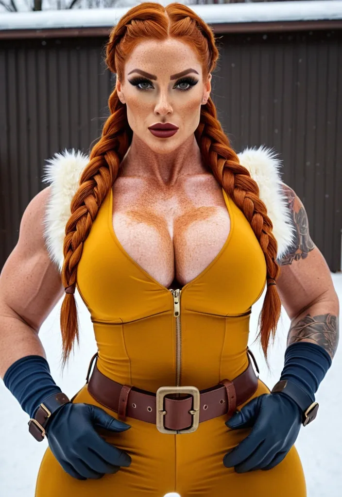 Generate Gorgeous female boss , bimbo , hourglass body , abnormally massive female bodybuilder , gorgeous , close up , full lips , big booty , redheaded , freckles on face and breast , braided design hair , feminine silhouette , too big breast , big booty , sexy thighs abs , silhouette , up close , flexing biceps , beautiful green eyes , legs are iconic and defining physical feature , both visually and in terms of combat ability.wearing an outfit that is a striking blend of elegance , power , and femininity , designed to command attention in any room. The suit is tailored to perfection , hugging the wearer’s curves with precision while emphasizing a structured silhouette. The fabric itself is a refined grey tweed patterned with subtle white grid lines , giving the suit a texture that feels both sophisticated and modern. The blazer features broad blue lapels and gold button accents , adding a luxurious touch that elevates the look beyond typical business attire. The matching high-waisted trousers elongate the frame , further enhancing the poised and commanding effect of the ensemble.The styling choices amplify the boldness of the suit. The inner blouse is a silky , greybutton-down shirt that complements the tweed’s tone while introducing a softer , feminine balance to the sharp tailoring of the jacket. The blouse peeks out neatly from under the blazer , maintaining elegance without drawing focus away from the suit’s commanding cut. Accessories are kept minimal yet intentional: a delicate layered gold necklace and hoop earrings that add glimmers of light and luxury without overpowering the outfit. The choice of voluminous , honey-brown braids cascading down her shoulders frames the face with both confidence and glamour , completing the commanding visual.Altogether , this look communicates a blend of authority and allure. It is business-ready yet fashion-forward , balancing corporate structure with vibrant femininity. The color palette blue , grey and gold avoids being overly delicate , instead embracing the richness of texture , structure , and presence. This is the kind of ensemble that speaks to ambition , sophistication , and personal style—ideal for someone who thrives in positions of influence but insists on expressing her individuality with bold elegance. It’s not just clothing—it’s a statement of power wrapped in grace. In luxury living legs that could crush a watermelon , skirt high boots are a bold and striking statement piece , crafted in glossy black patent leather that gives them a sleek , polished finish. Rising to just below the knee , the boots feature three adjustable buckle straps along the shaft , adding both edge and detail to their design. The towering stiletto heel , paired with a thick platform sole , creates an ultra-dramatic silhouette that elongates the leg and exudes power and confidence. With their combination of shine , height , and structure , these boots perfectly balance fierce femininity with high-fashion allure. Massive breast , massive cleavage , Up close shot She wears a sleeveless mustard-yellow fitted top with white fur trim at the shoulders , paired with dark blue reinforced pants featuring brown leather straps and a utility belt , finished with tan work boots and brown gloves for a rugged , adventurer-style outfit. ,