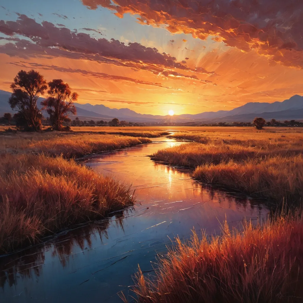 A breathtaking sunset landscape masterpiece , masterfully crafted in the rich tradition of oil painting. The scene features a vast , open plain leading to a distant mountain range , set against a towering sky ablaze with the final , dramatic light of day. The sky is a canvas of intricately layered color: deep crimson and burnt orange at the horizon , seamlessly transitioning through bands of soft violet and dusky blue into the twilight above , all rendered with visible , textured impasto strokes that catch the light. In the midground , a glassy , reflective river meanders through the plains , perfectly mirroring the fiery sky and creating a central focal line of luminous calm. Gently backlit by the dying sun , clusters of trees and wild grasses on the riverbanks are detailed with expressive , organic brushwork , their forms glowing with warm halos. The entire composition is bathed in a soft , diffused golden-hour glow that casts long , dramatic shadows , emphasizing the vast scale and serene , melancholic beauty of the moment. The painting exhibits high-fidelity detail , from the individual blades of grass to the delicate cloud wisps , achieving a photorealistic texture within a deeply artistic , emotive style. ,