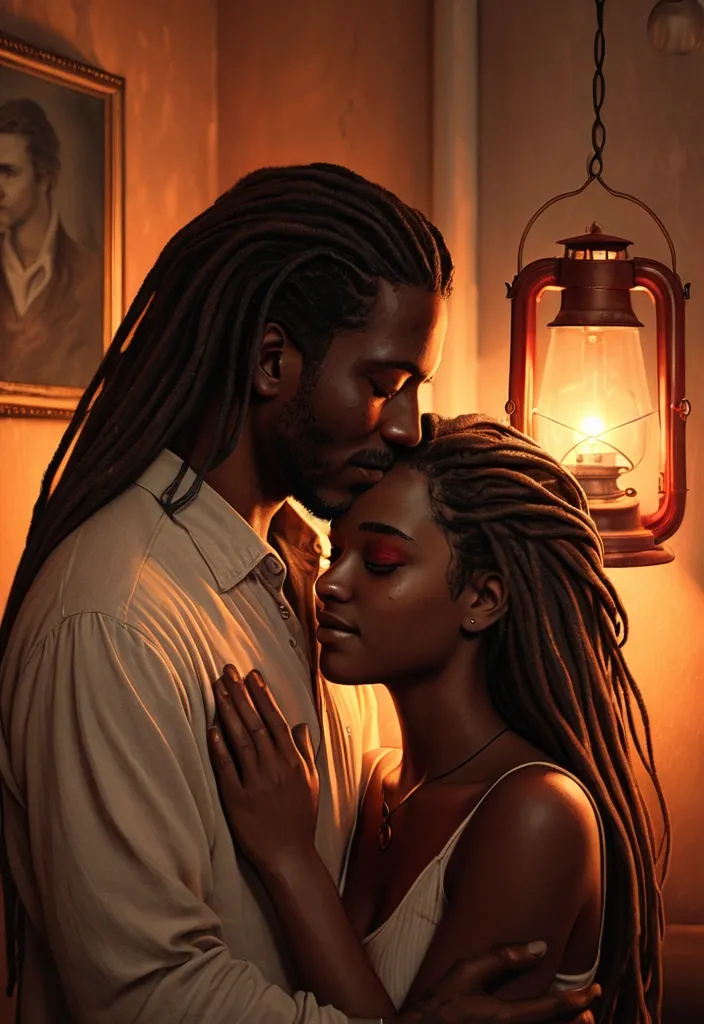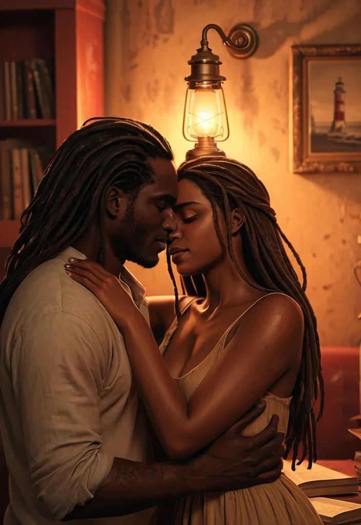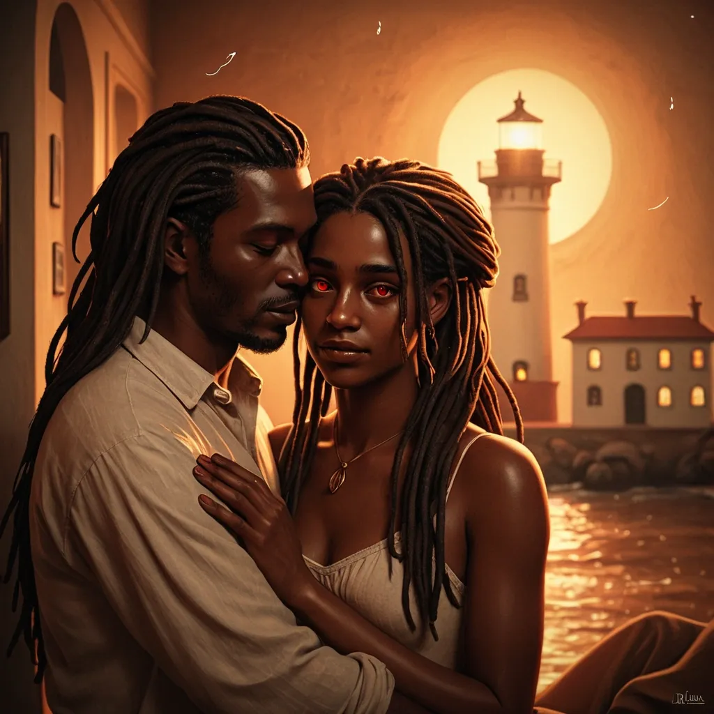 Artstation , Drawing , Graphite , Charcoal Art , "Illustration: A nostalgic scene depicting a couple in a warm , intimate embrace. The woman , with dark skin , long dark dreadlocks , and naturally red eyes , is held closely by the man , who has dark skin , dreadlocks , and striking light eyes. They are bathed in the soft , golden light of a vintage lamp , suggesting a cherished memory. The background is blurred , hinting at a cozy room filled with personal touches – perhaps books , records , or art. The woman's expression is serene and content , while the man's gaze is filled with affection. The overall mood is one of deep love , comfort , and a sense of timeless connection. The style is soft and romantic , reminiscent of a vintage photograph or a classic painting. The color palette is warm and inviting , with golds , browns , and soft reds dominating. The scene should evoke the feeling of a 'farol na escuridão' (lighthouse in the darkness) and a 'chama que aquece o coração' (flame that warms the heart) , as described in the verse. To emphasize the 'melodia da vida' (melody of life) , subtle musical elements could be incorporated , such as a record player in the background or faint musical notes floating in the air." ,
