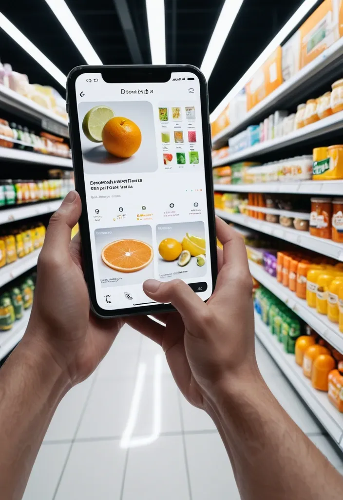 First-person perspective inside a brightly lit supermarket aisle or section. Realistic human hands are holding Limonia close to the camera. The product’s [key visual traits: color , texture , packaging , freshness details] are clearly visible under natural store lighting. The Limonia is surrounded by a multi-layered holographic augmented reality interface displaying relevant product information , including [nutritional or product data such as calories , protein/sugar/caffeine , vitamins , freshness indicator , origin , expiration date , usage or recipe suggestions]. The AR UI elements smoothly shift and reorganize based on the viewer’s gaze direction , as if dynamically responding to user focus. In the left peripheral vision , a vertical semi-transparent shopping list is visible with checked-off items , where Limonia is highlighted as the currently active selection. Hyper-realistic mixed reality , clean futuristic AR design , glass-like UI panels , soft ambient glow , realistic lighting and shadows , natural depth of field , immersive first-person interface , showcasing next-generation retail technology. ,